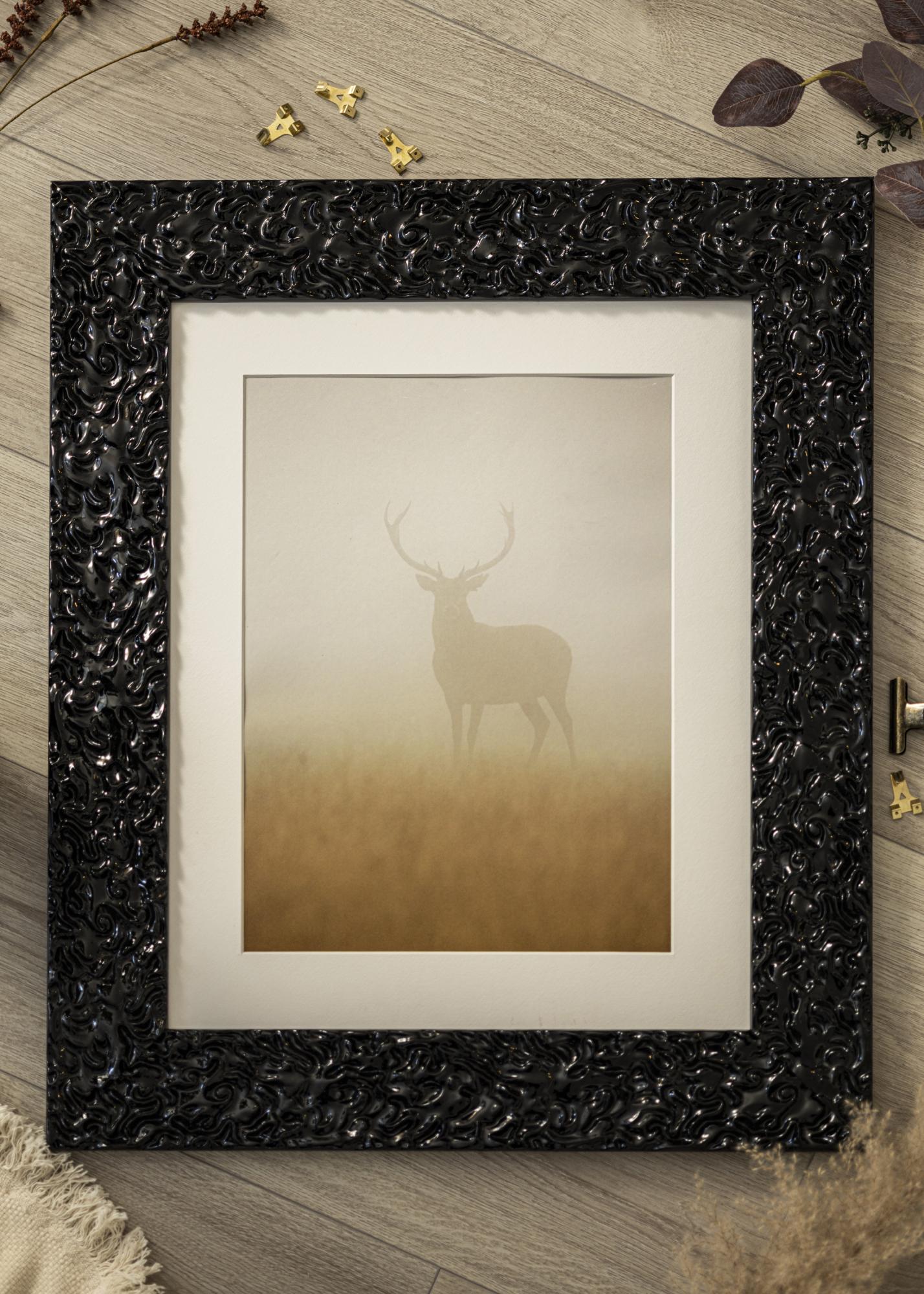 Esta moldura é feita de pinho, o que proporciona uma sensação durável e de qualidade. O padrão orgânico na superfície acrescenta um toque moderno, enquanto o acabamento brilhante confere uma impressão luxuosa. Moldura Westminster Preto é perfeita para quem procura uma moldura atraente que combina inspiração clássica com uma sensação contemporânea.