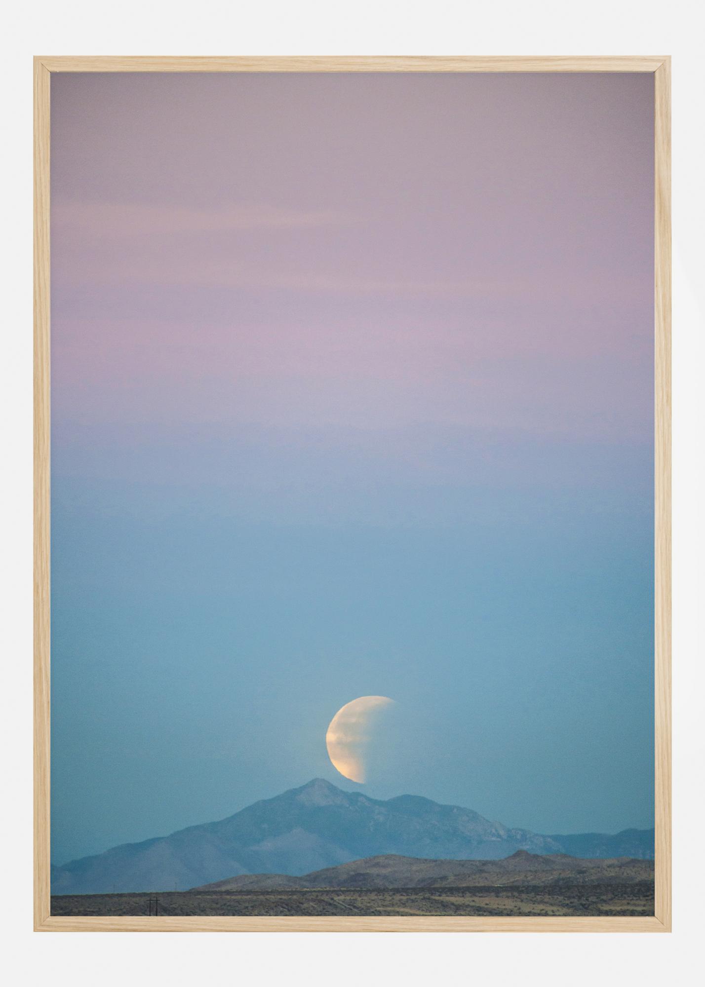 Um belo póster de uma lua no topo de uma montanha. O céu transita da cor de fundo verde para a cor rosa do primeiro plano. Postes de eletricidade são visíveis no terreno acidentado do primeiro plano. Traga a beleza das maravilhosas vistas da mãe natureza para a sua casa.