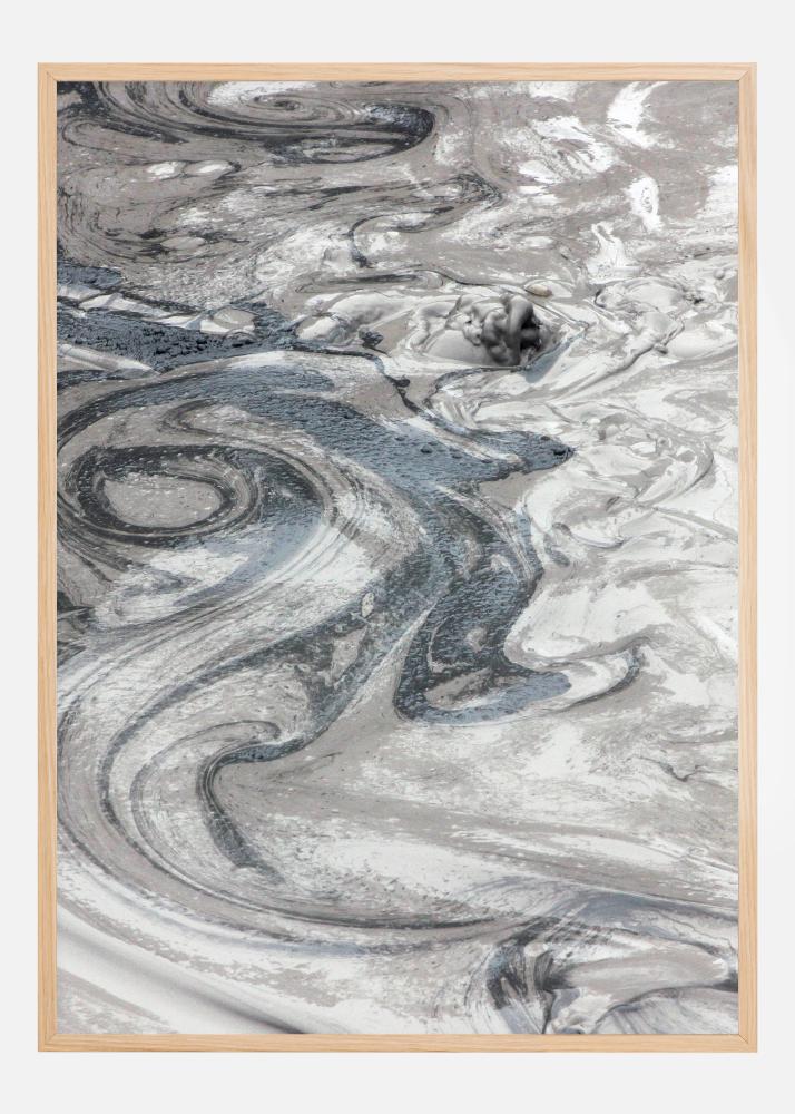 Uma foto impressionante de um rio de lama que forma uma superfície semelhante a chocolate. As suaves correntes pretas, bege e brancas se fundem perfeitamente, criando um padrão de fantasia. Para uma sala de estar super moderna, este é o póster perfeito para pendurar numa parede bege.