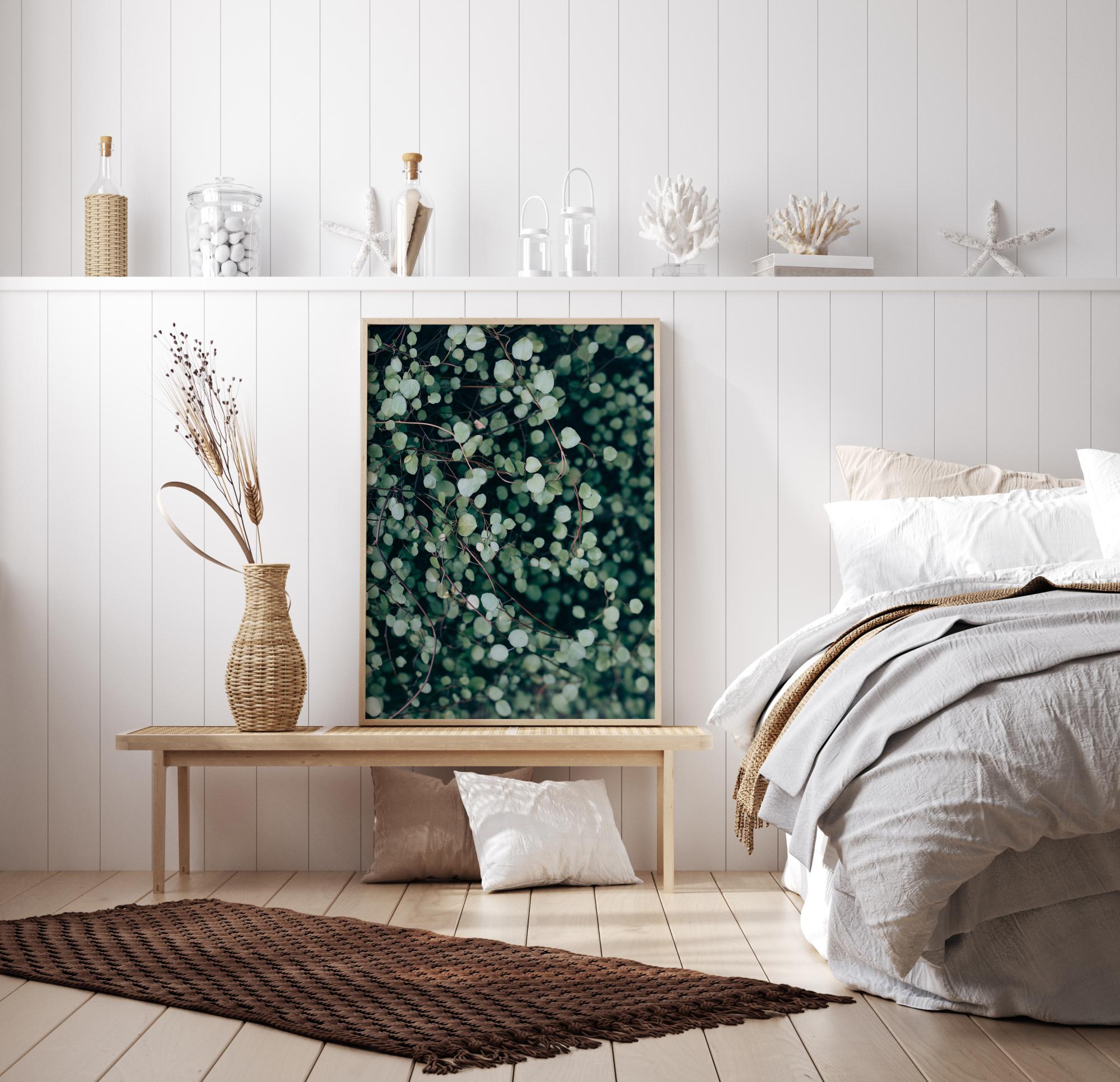 Um belo póster em close-up verde com uma trepadeira deslizante com as suas muitas folhas e galhos. Pequenas folhas redondas brilham alegremente à luz do sol. O fundo preto faz as folhas se destacarem ainda mais. Pendure esta impressão numa parede verde clara para dar um toque calmante a um ambiente.