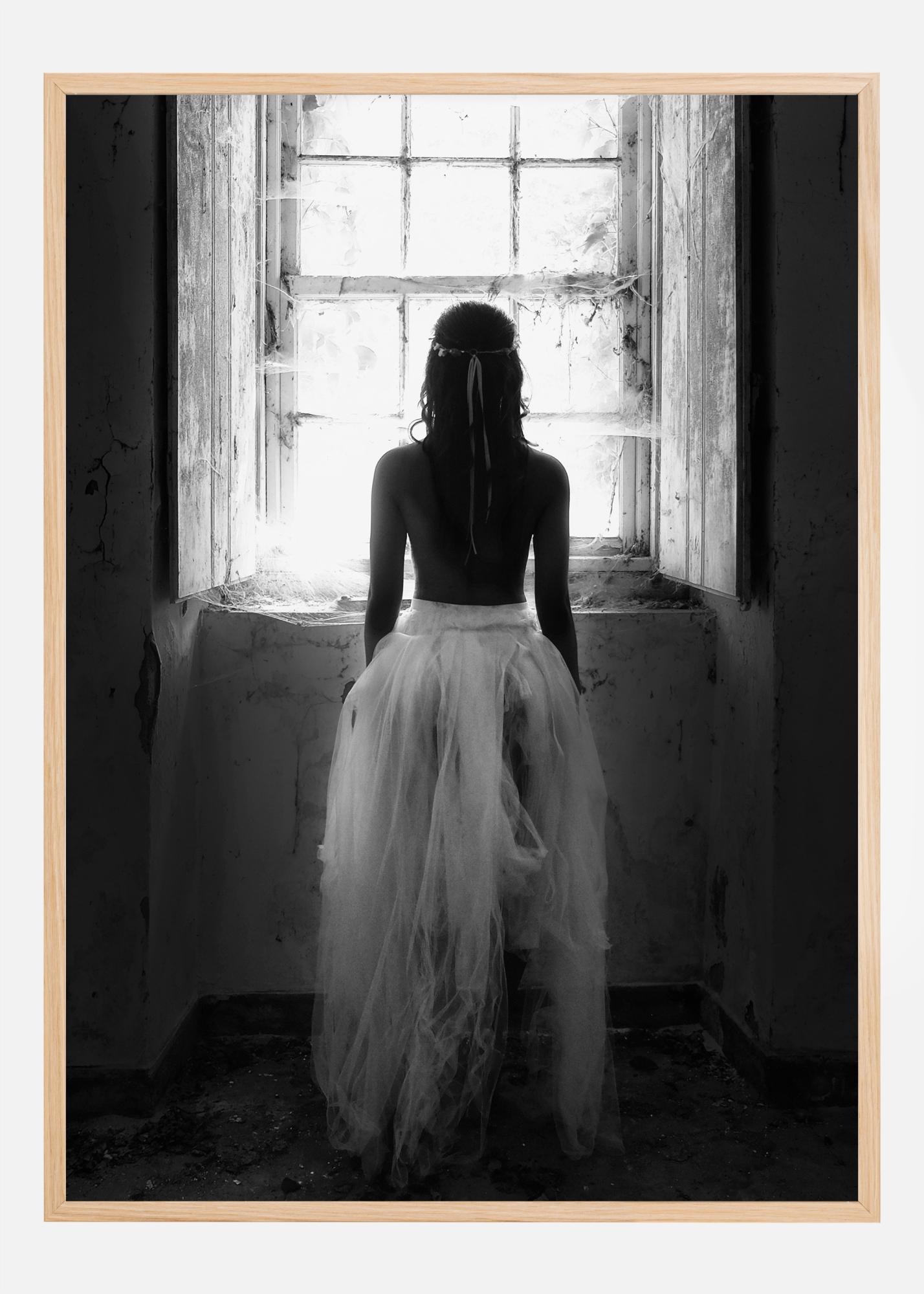 Uma bela foto em preto e branco de uma mulher seminua em pé perto de uma janela antiga. A janela suja está coberta de teias de aranha e a mulher olha para fora pela janela. Vestida com uma saia de tule branca, a jovem mulher parece estar profundamente absorta em pensamentos. Um póster perfeito para pendurar em um quarto.