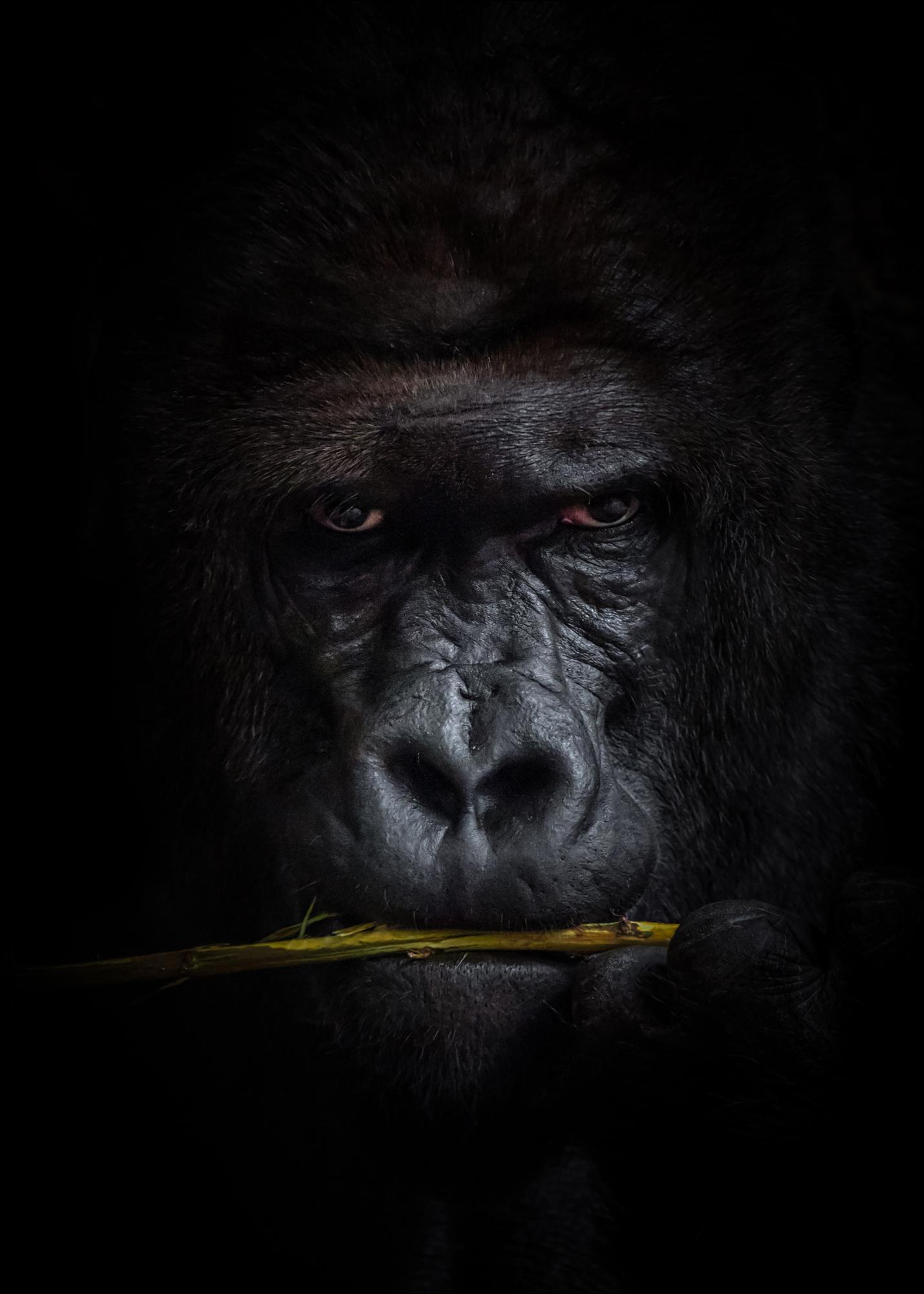 Um retrato em close-up de um gorila roendo a casca de um galho. O olhar está voltado para o fotógrafo e a pelagem escura se funde ao fundo preto, criando uma bela profundidade para o motivo. Um póster poderoso com um encontro íntimo com um dos maiores primatas da floresta tropical.
