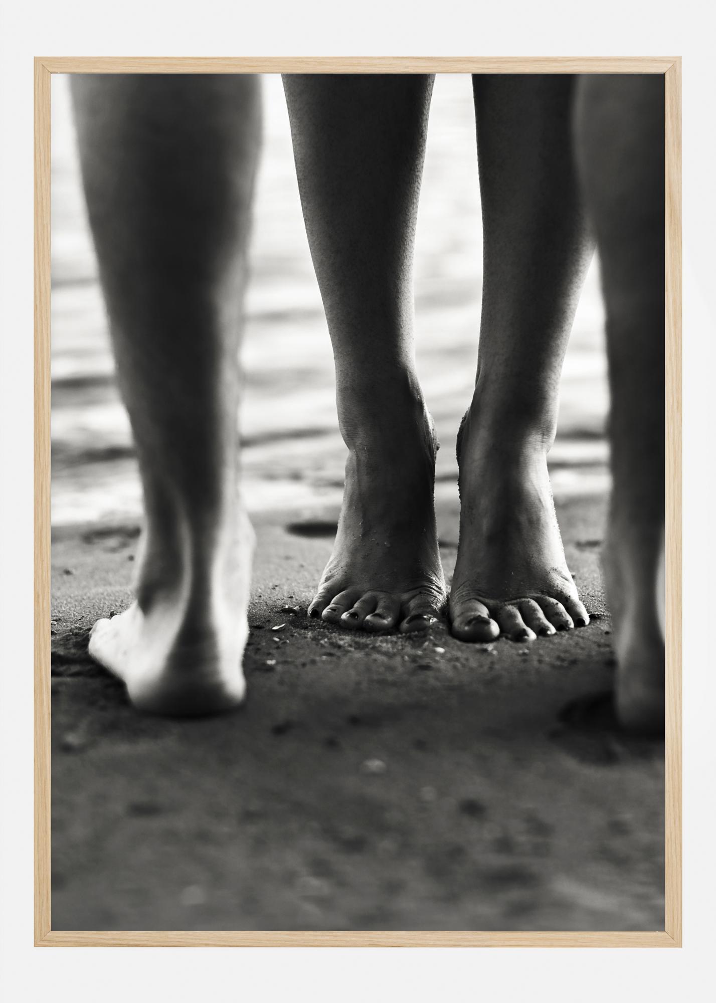 Um póster romântico com um close em preto e branco de quatro pernas em uma praia. A imagem retrata duas pessoas de frente uma para a outra. O olhar facilmente se fixa na figura que está nas pontas dos pés. Esta bela impressão traz uma sensação romântica e se encaixa no seu quarto quando deseja um toque de romantismo.