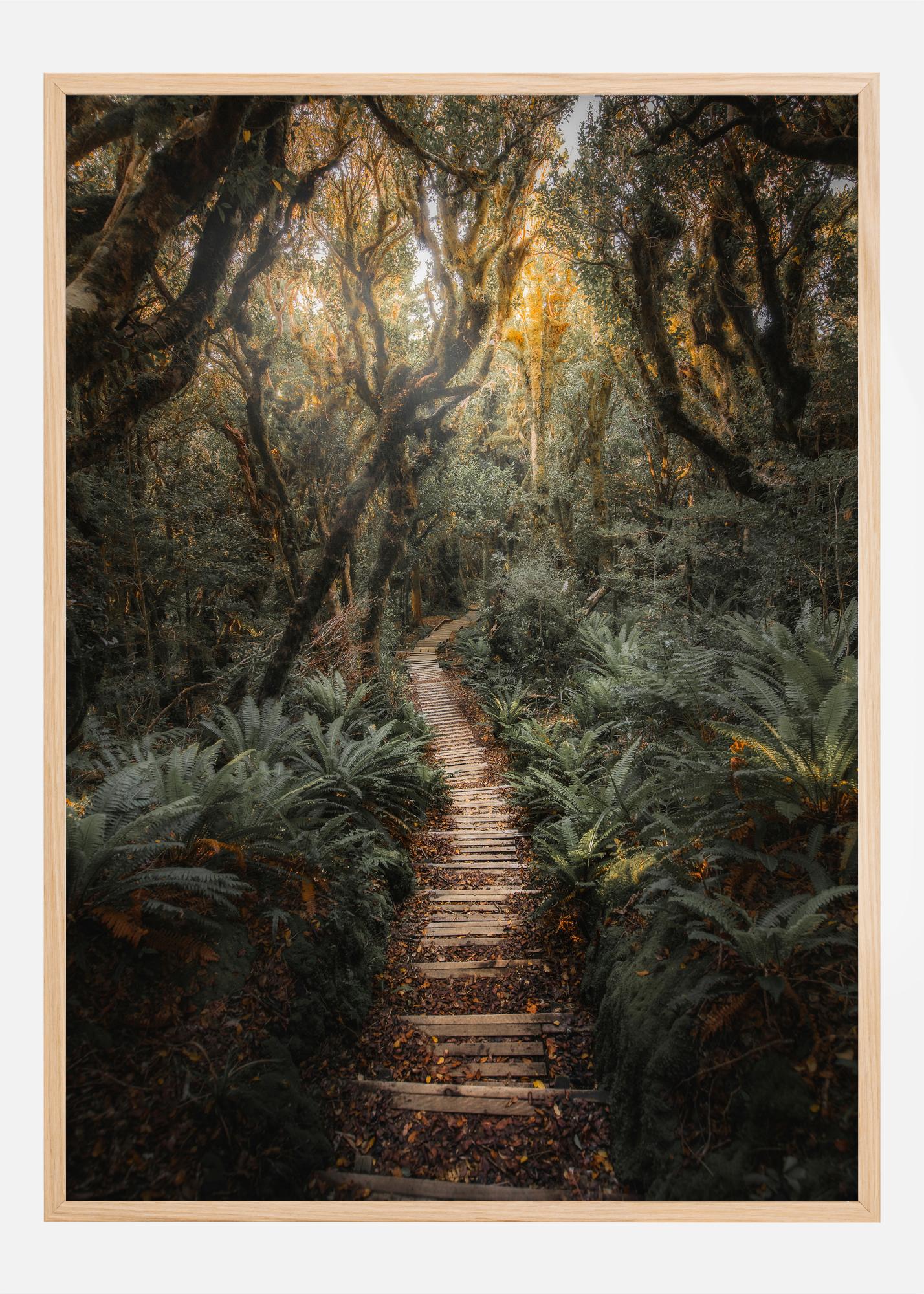 Explore o reino encantado da natureza com este poster cativante que captura um caminho misterioso serpenteando por uma antiga floresta. Esta impressão dá vida a um mundo onde o tempo parece ter parado, onde as árvores tortuosas revestidas de musgo e samambaias em exuberantes tons de verde emolduram um estreito caminho de tábuas de madeira. Os raios de sol penetram pela folhagem, criando um brilho mágico que destaca a beleza da floresta e a profundidade de seu silencioso salão de folhas. Este poster não é apenas uma imagem; é um convite para percorrer pelos caminhos do pensamento e descobrir o desconhecido.