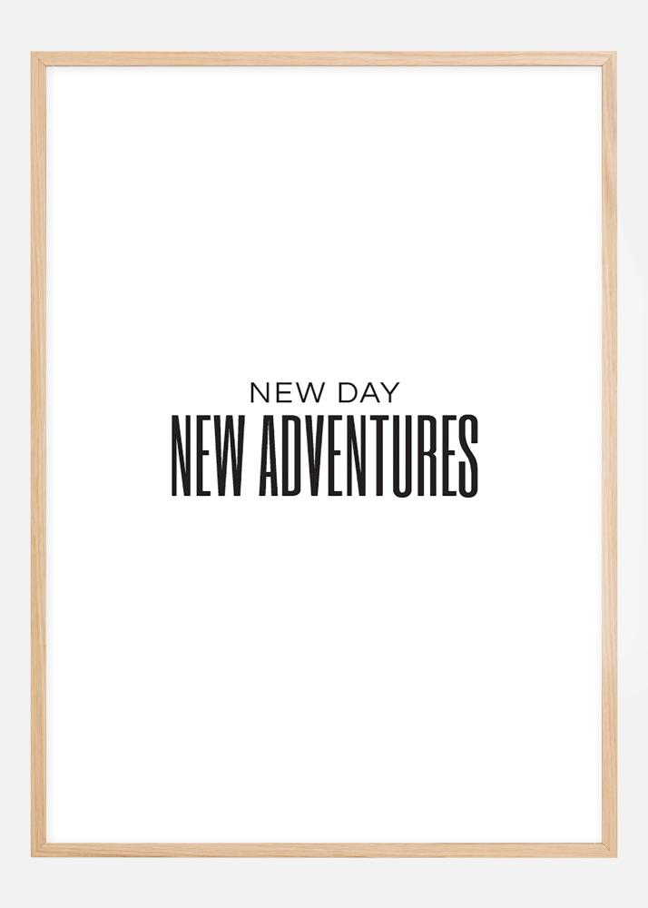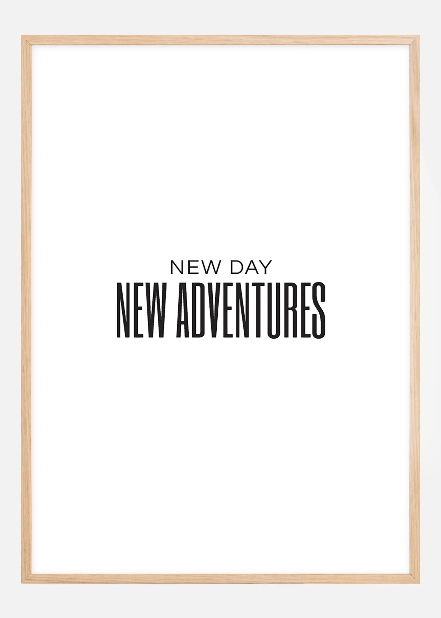 Um póster simples e elegante com letras maiúsculas e a mensagem "Novo dia, novas aventuras". pósteres de texto são elementos perfeitos em colagens maiores e paredes de quadros. Complemente com algo da nossa ampla seleção de molduras.
