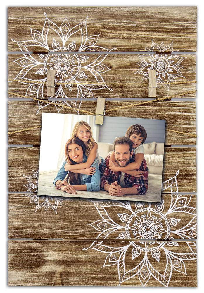 Esta é uma bela colagem de fotos onde as imagens são fixadas com pregadores de madeira decorativos. As imagens são fixadas num fundo de madeira com flores pintadas de branco num design boêmio. A moldura tem espaço para duas fotos de 10x15 cm. As dimensões externas da moldura são 32x48,5 cm. Esta colagem de fotos pode ser combinada perfeitamente na parede com outras pinturas para criar uma aparência elegante na sua casa. Suporte de parede incluído.