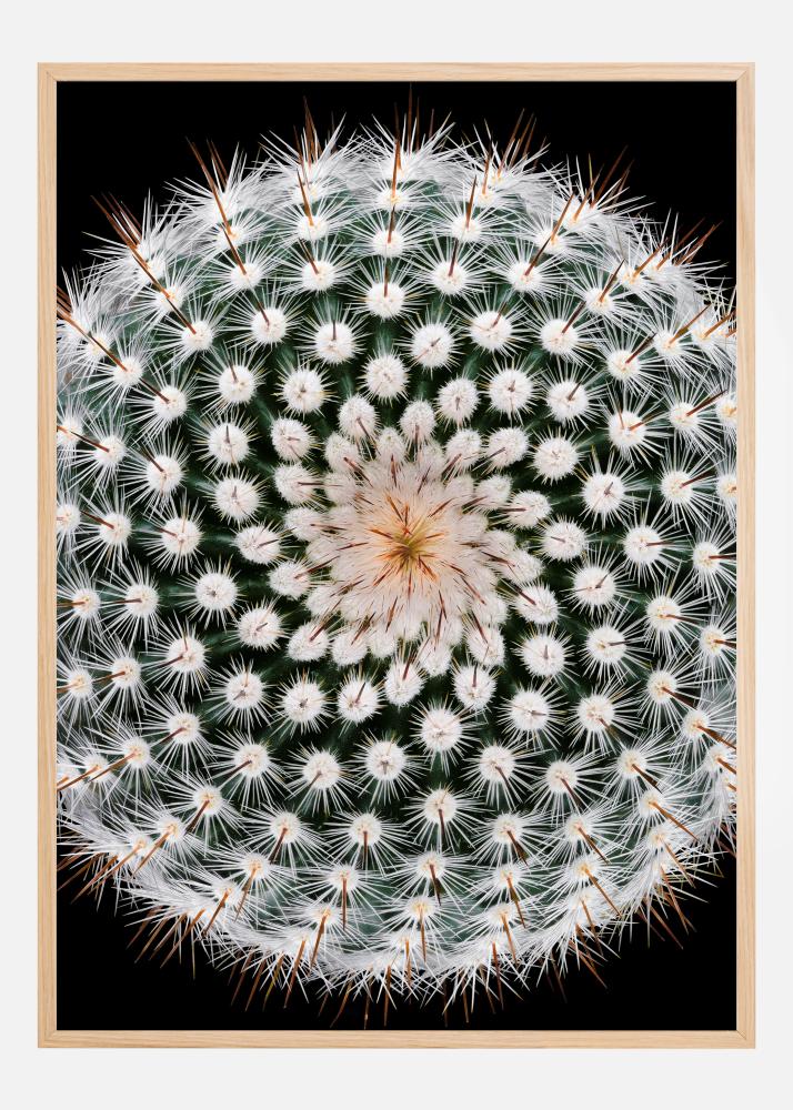 Uma foto aérea de um cacto com flores brancas. Num fundo preto, a cor verde escura destaca as flores brancas e as pontas afiadas. A parte central da planta tem um toque leve de amarelo, o que adiciona cor extra à impressão. Um póster perfeito para todos que amam plantas.