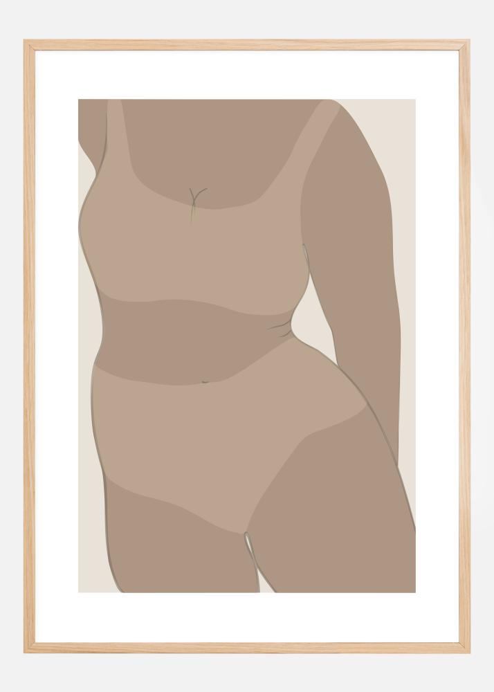Um póster bege com uma mulher em sua roupa íntima. Num fundo bege claro, são visíveis as coxas curvilíneas de cor castanha claro e um pequeno espaço separa os seios. Uma impressão simples que mostra a beleza de uma mulher em roupa íntima. Admire a beleza desta mulher.