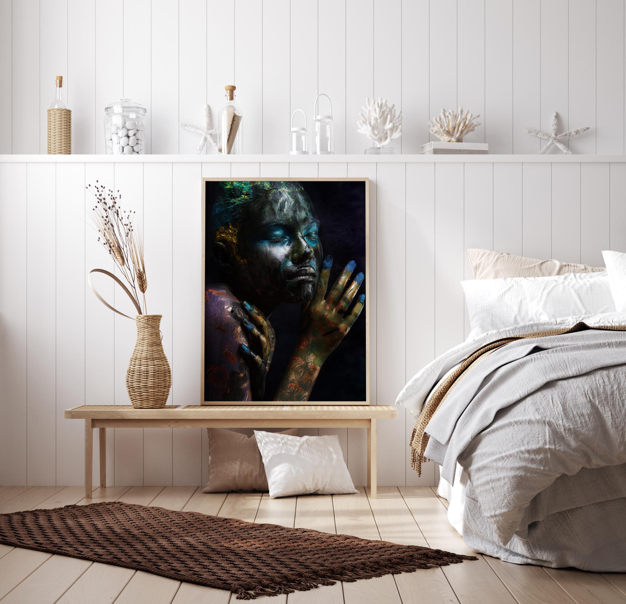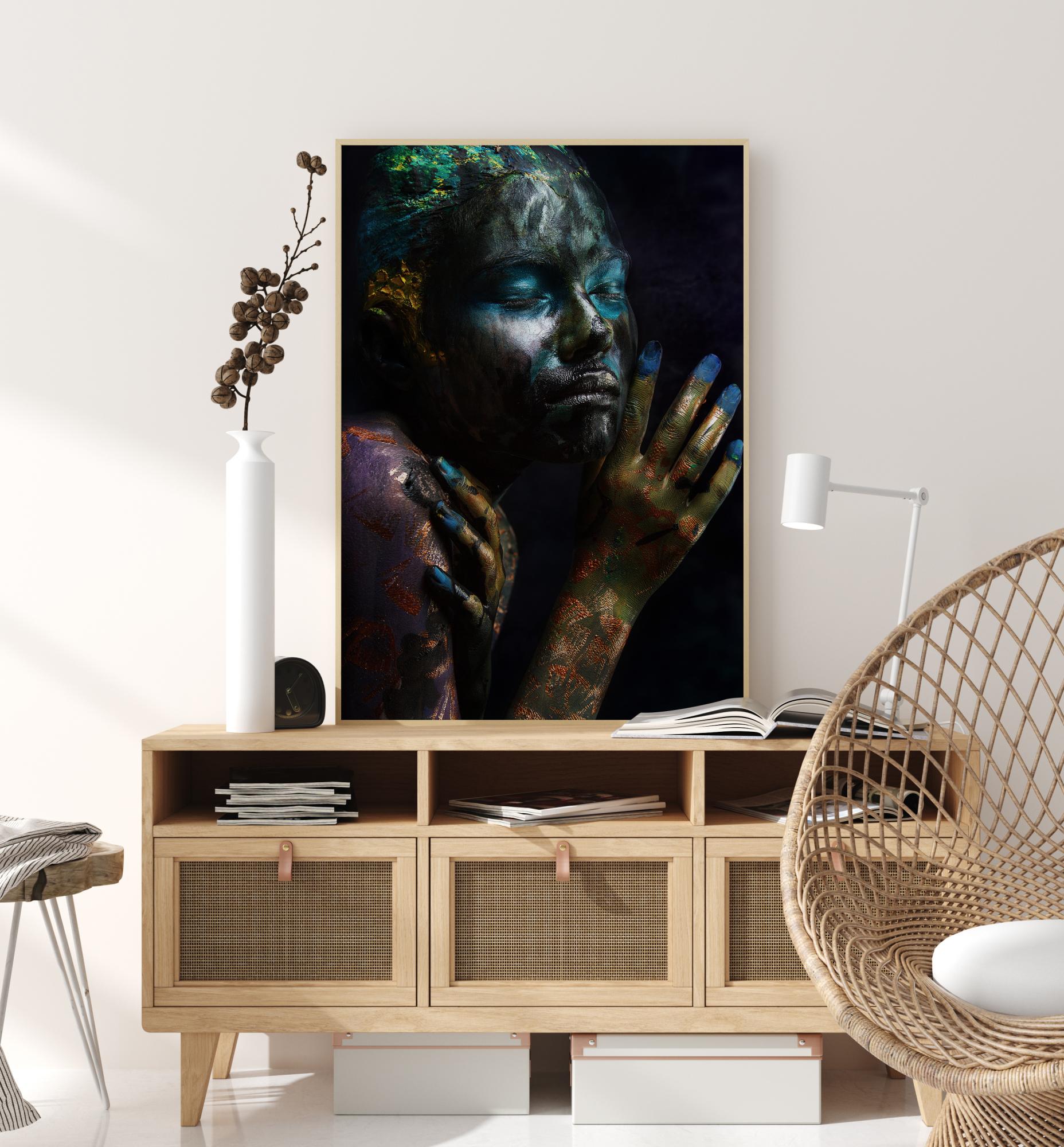 Uma imagem impressionante de uma mulher coberta de cores. Num fundo preto, a mulher está coberta de cores vívidos. A intensidade das cores é realçada pela luz natural que ilumina o rosto e os ombros da mulher. Um belo póster que pode adicionar cor a uma parede branca.