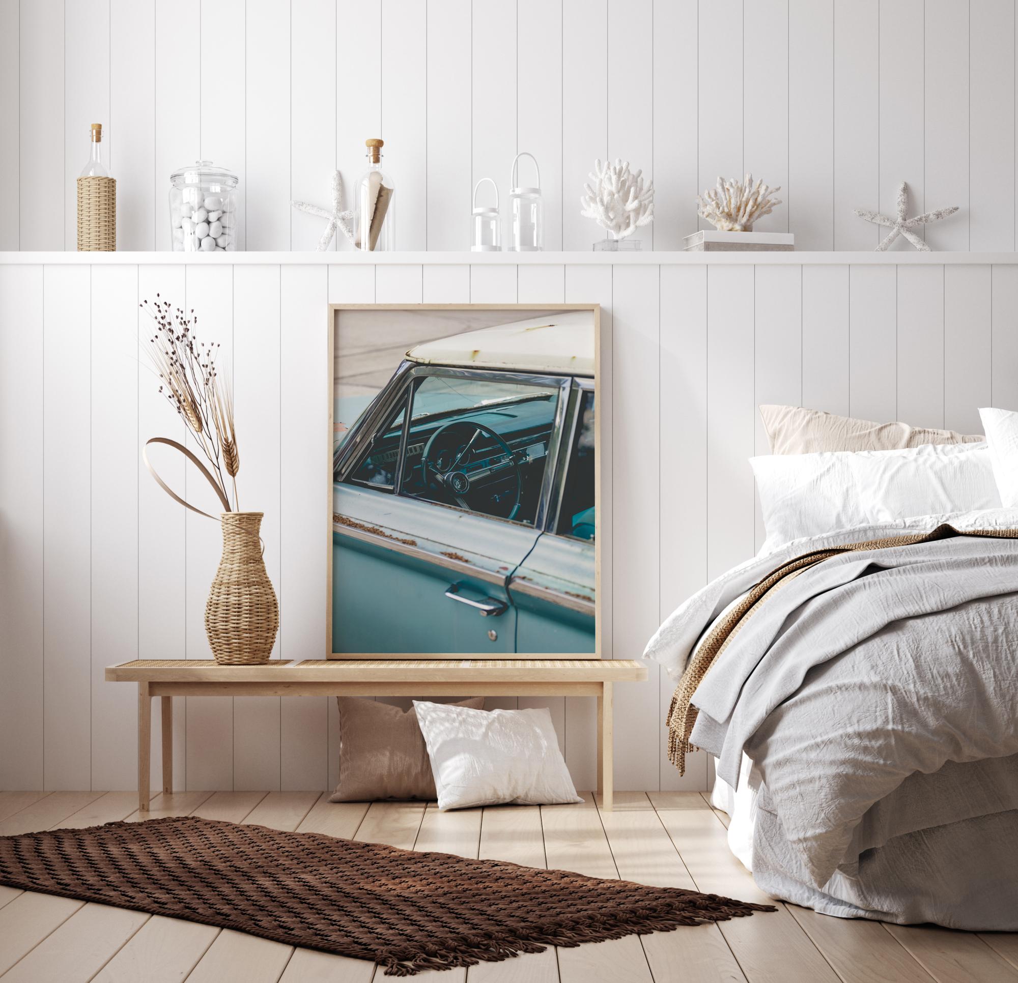 Um póster incrível em close-up que mostra um carro antigo enferrujado com um volante vintage e um velocímetro. O modelo de carro azul claro nos leva de volta aos anos 1950 com os modelos de carros mais legais. Uma impressão perfeita para pendurar num ambiente com estilo vintage.