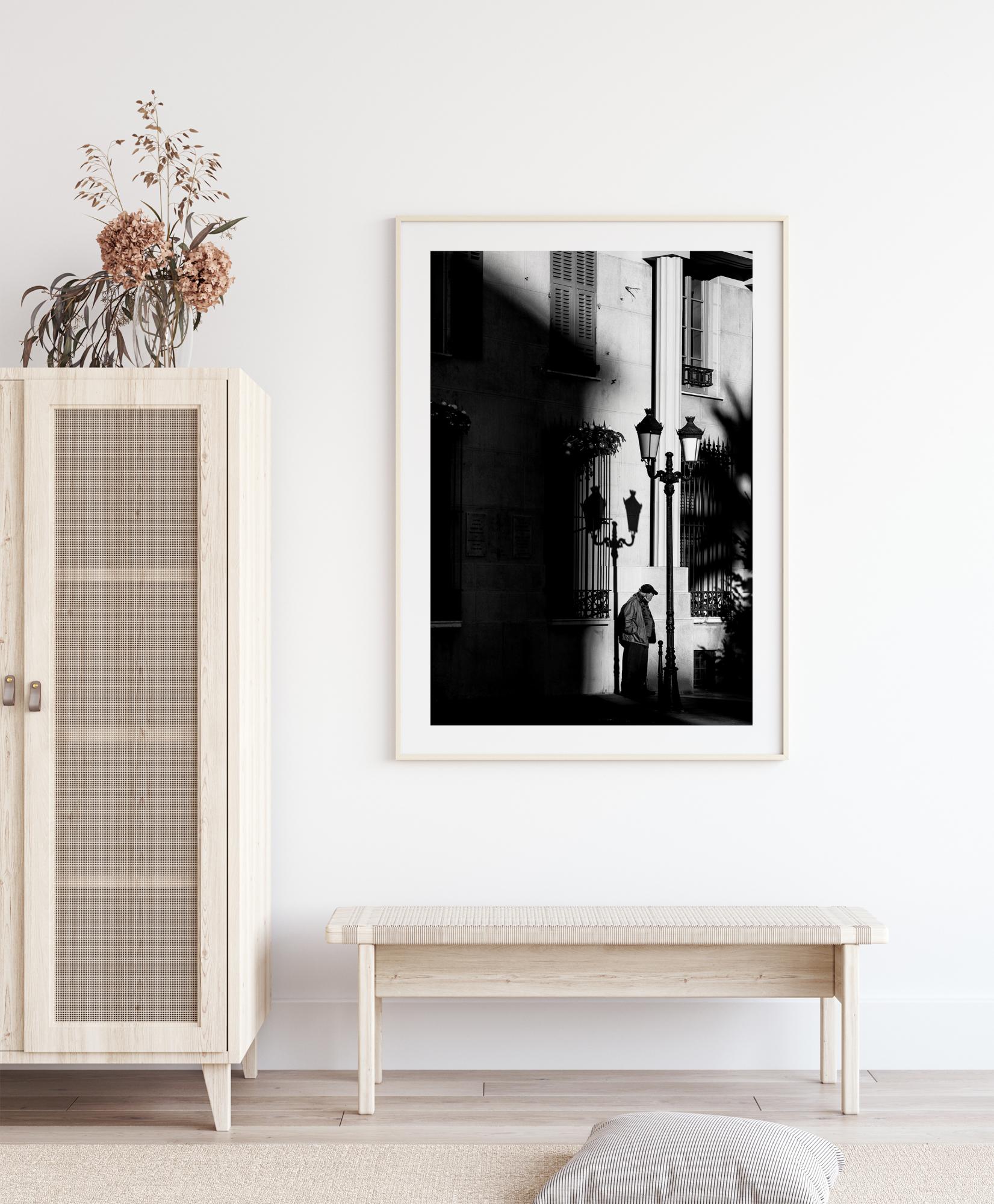 Uma fotografia em preto e branco de um homem idoso, com um olhar de busca, parado e observando algo cercado pelas vívidos sombras da cidade. Um póster calmo e bonito que fica tão bom sozinho quanto junto com outros favoritos numa galeria de parede maior.