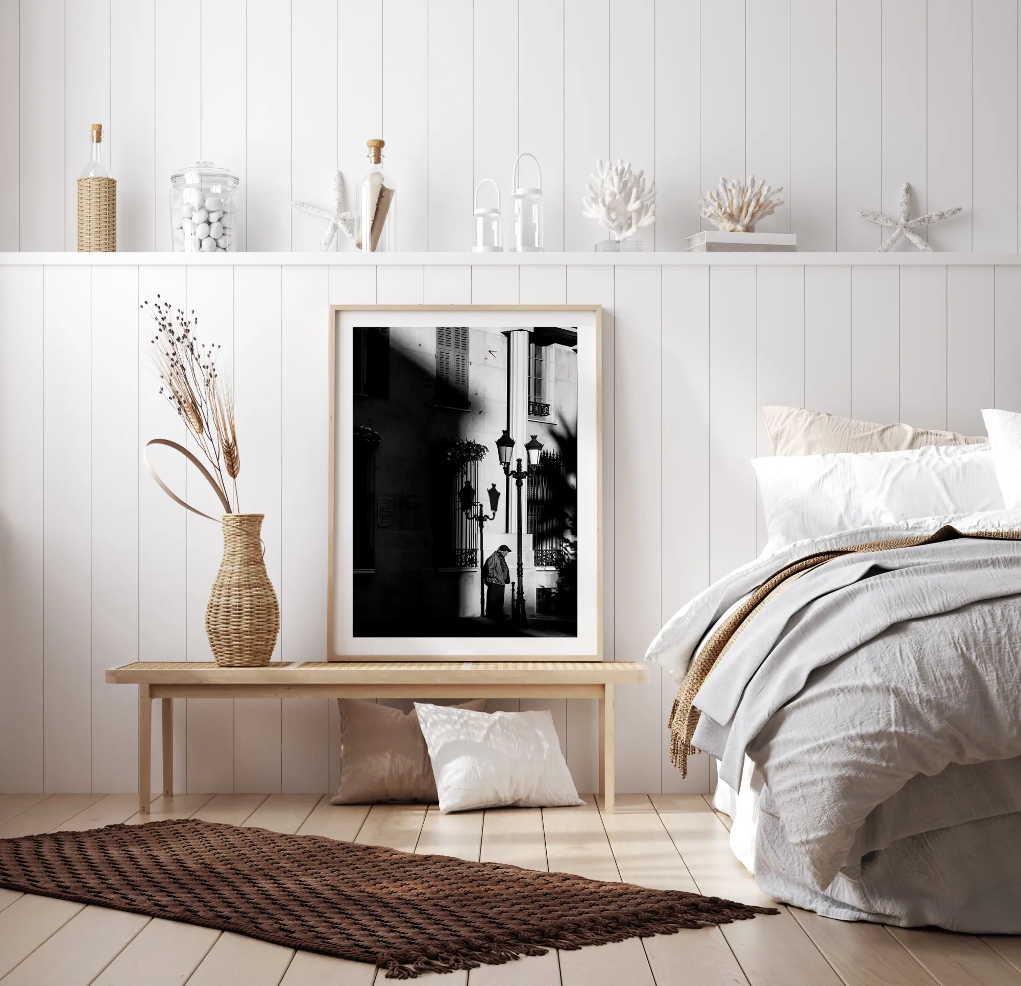 Uma fotografia em preto e branco de um homem idoso, com um olhar de busca, parado e observando algo cercado pelas vívidos sombras da cidade. Um póster calmo e bonito que fica tão bom sozinho quanto junto com outros favoritos numa galeria de parede maior.