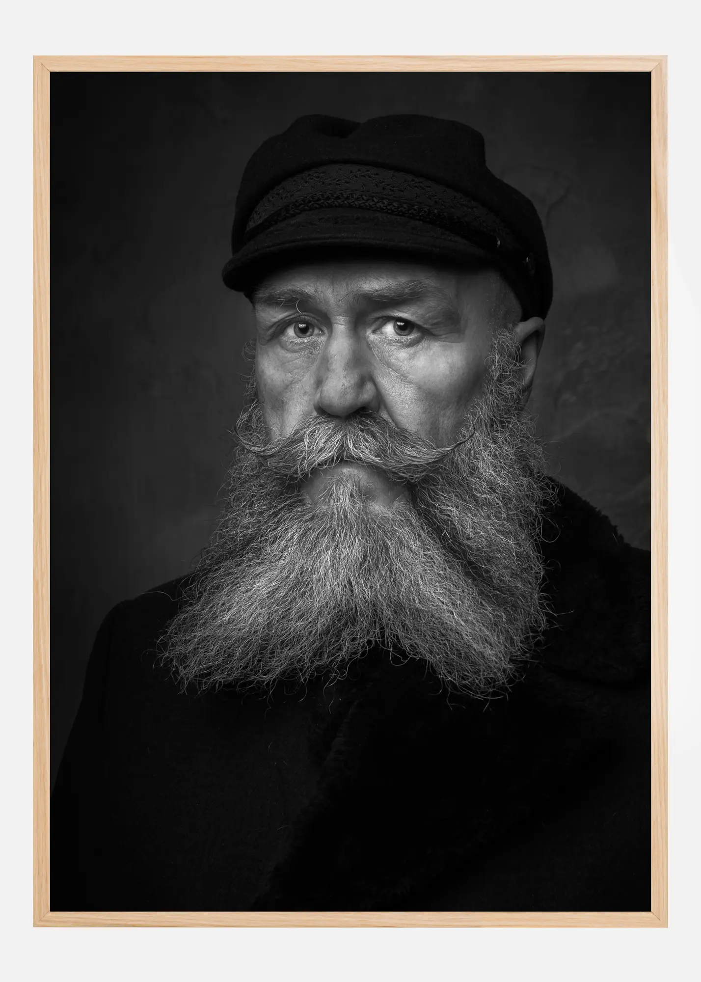 Uma magnífica foto em preto e branco em close-up de um homem vestido de forma que denota sua fama. Ele está usando um boina, um casaco preto e tem um bigode americano e uma barba longa. O fundo desfocado é cinzento. Para os amantes de roupas antigas e história, este póster é irresistível.