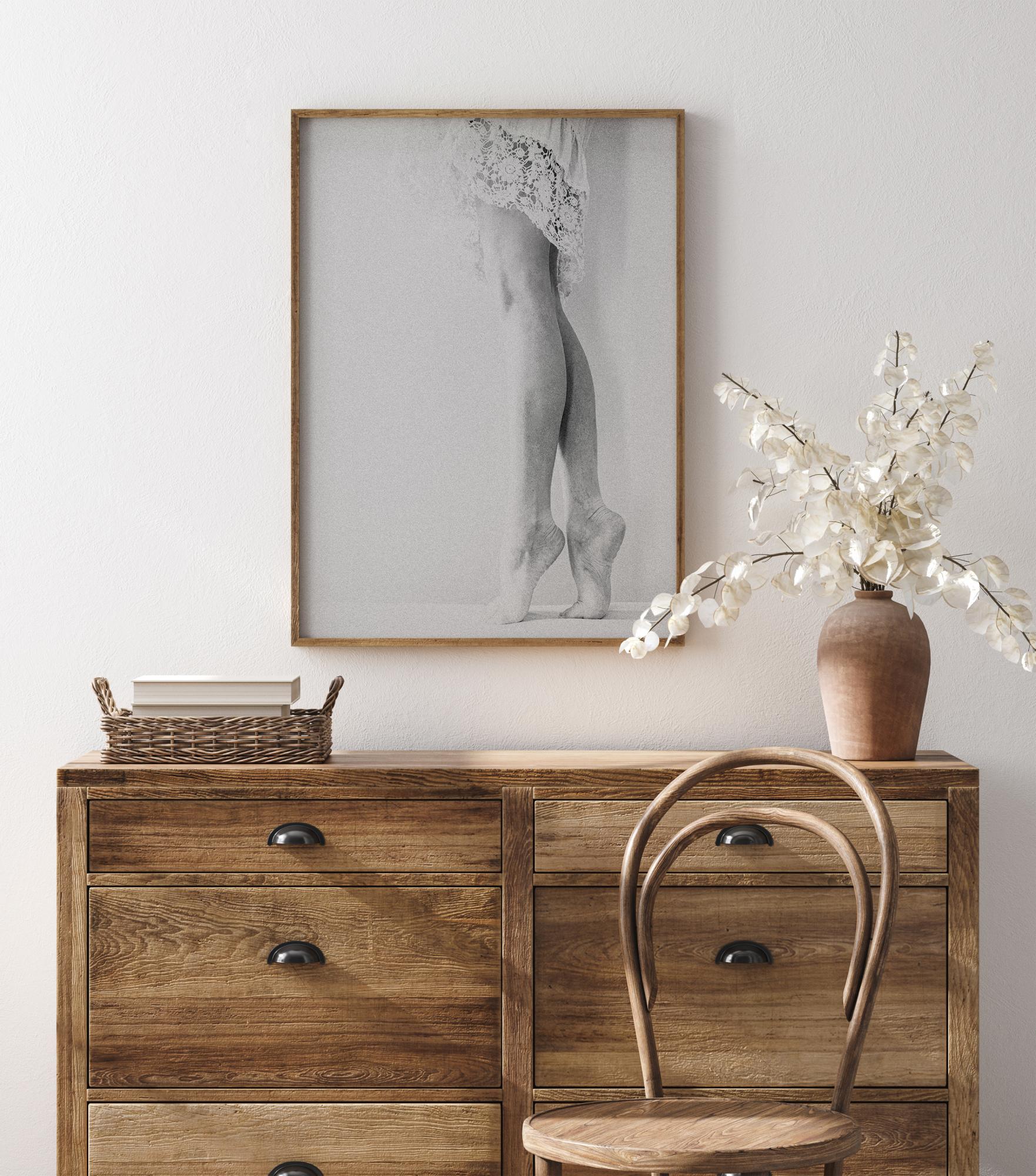 Um elegante meio retrato de uma mulher em pontas dos pés. A simplicidade da imagem combinada com o branco sutil torna esta imagem uma excelente adição ao seu quarto ou sala de estar.