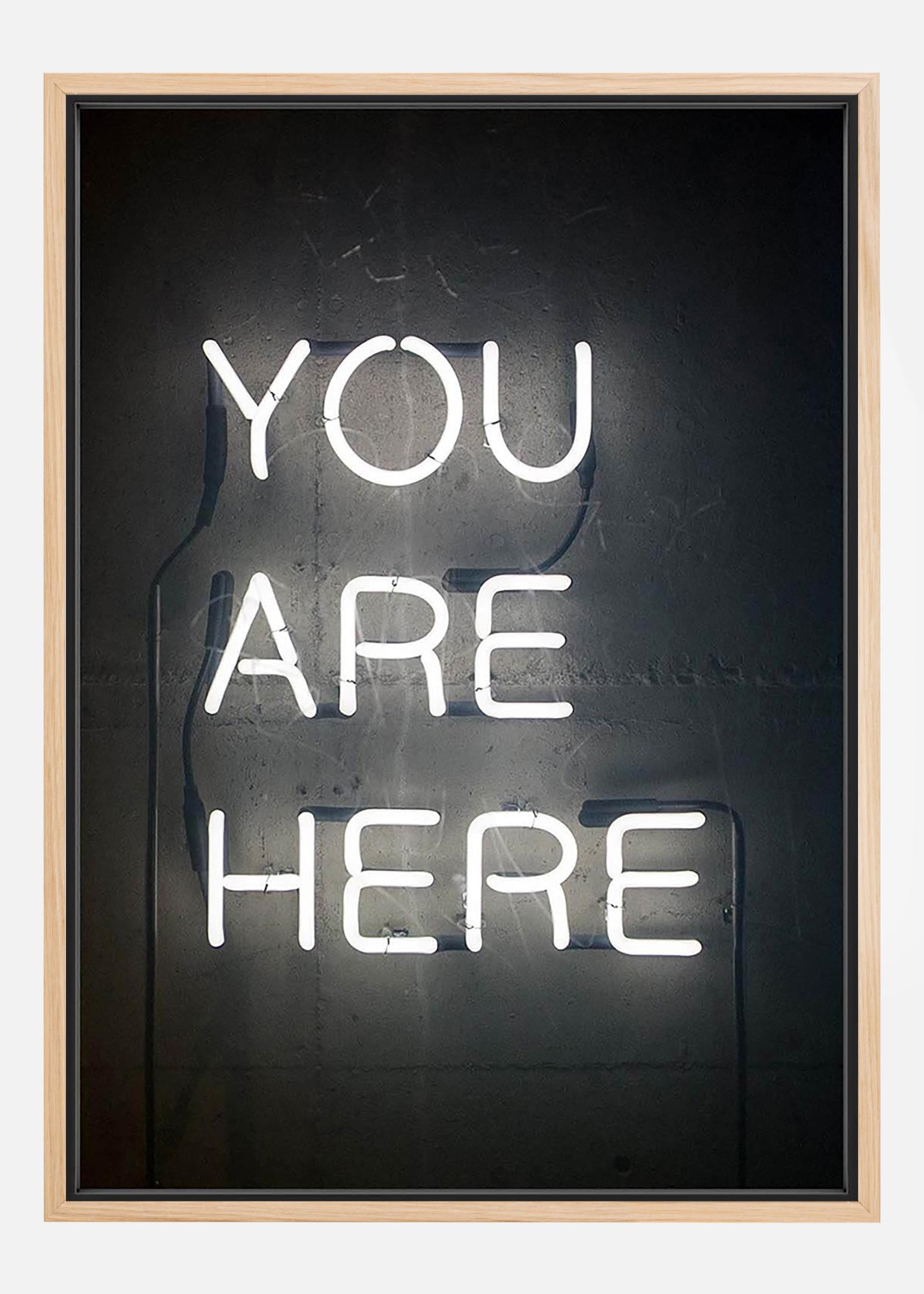 Um póster de texto preto e branco de uma placa de néon com o texto informativo "Está aqui". Uma tela simples e elegante com um toque humorístico agradável, perfeita para combinar com outras das nossas incríveis imagens numa galeria de parede maior.