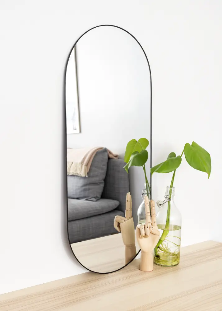 Duro encontra macio neste espelho interessante e muito elegante em design escandinavo da KAILA. A borda fina de metal preto dá ao espelho uma sensação industrial, ao mesmo tempo em que a forma oval lhe confere uma impressão suave e elegante. É um espelho moderno que se destaca de uma maneira muito sofisticada.