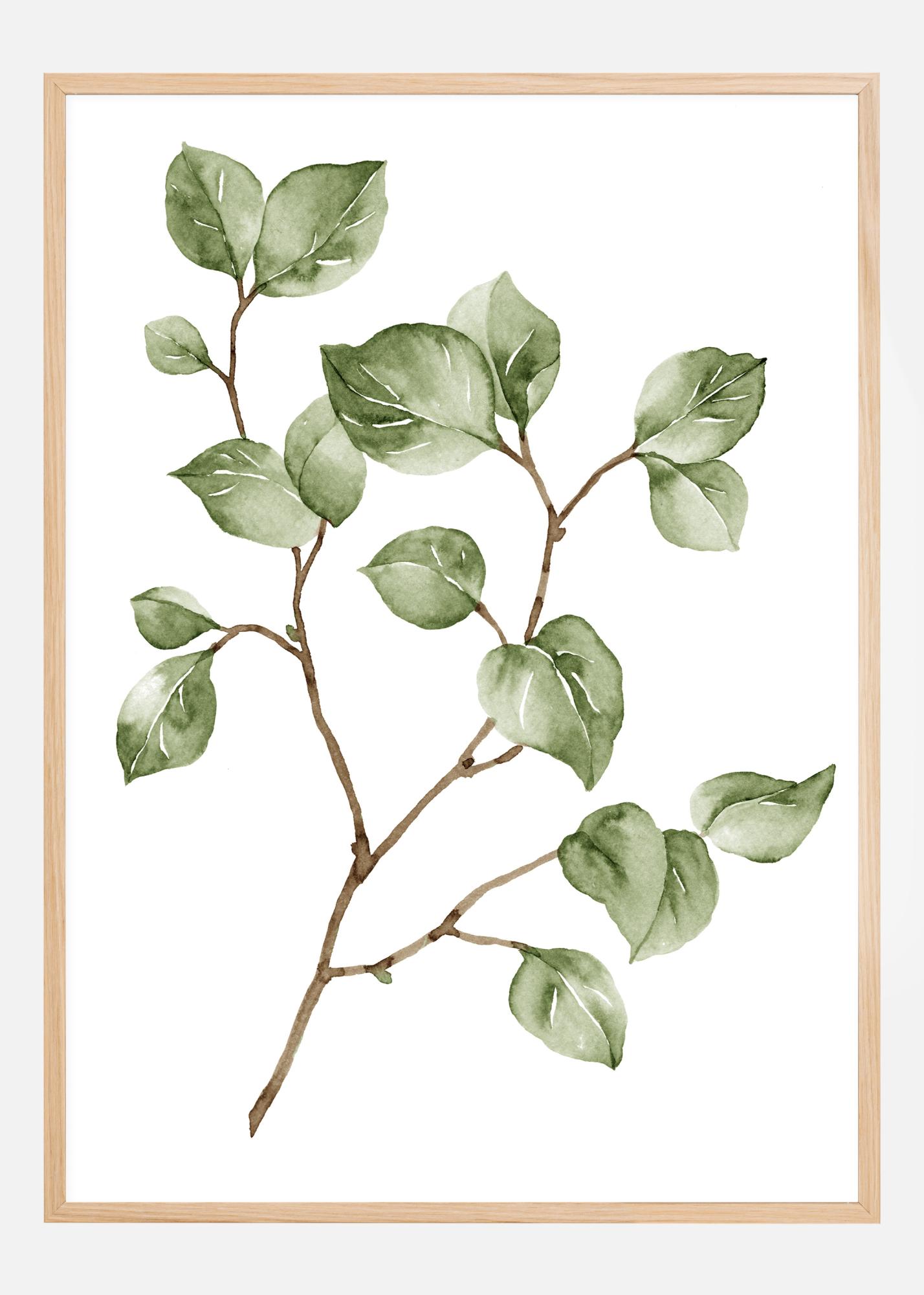Um belo póster com um fino galho marrom com pequenas folhas verdes. Pintado em uma superfície branca, destaca as cores suaves de marrom e verde e as delicadas veias brancas nas folhas. Uma bela impressão para pendurar numa parede verde-claro.