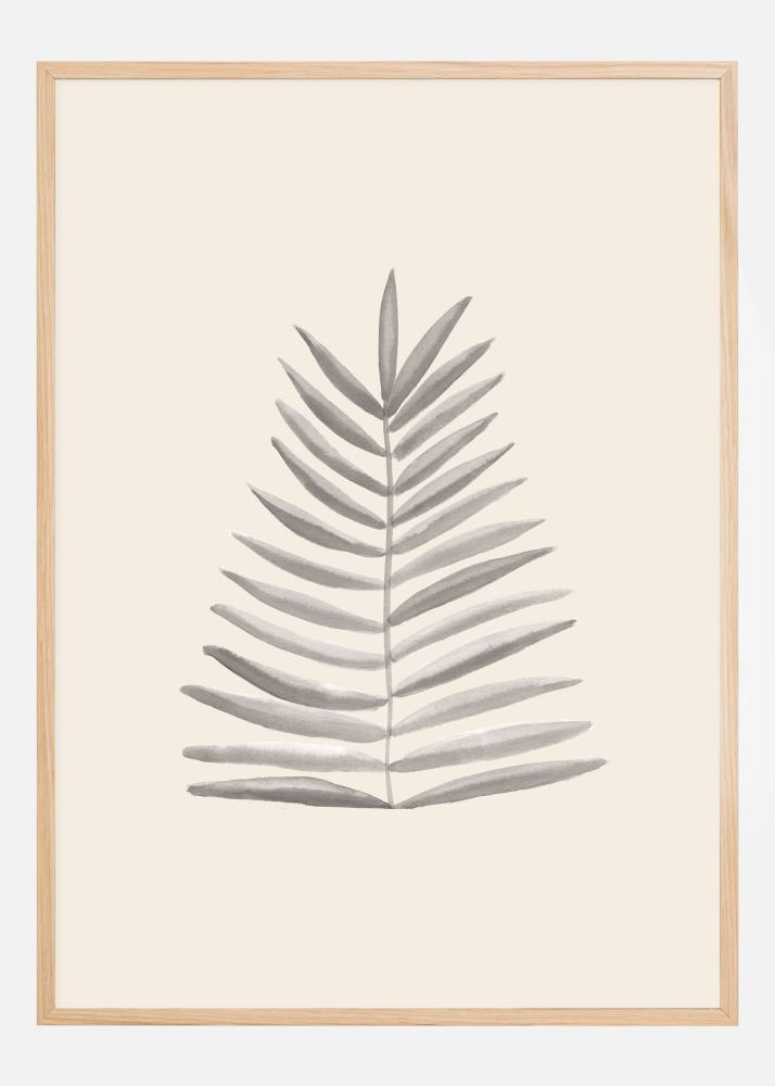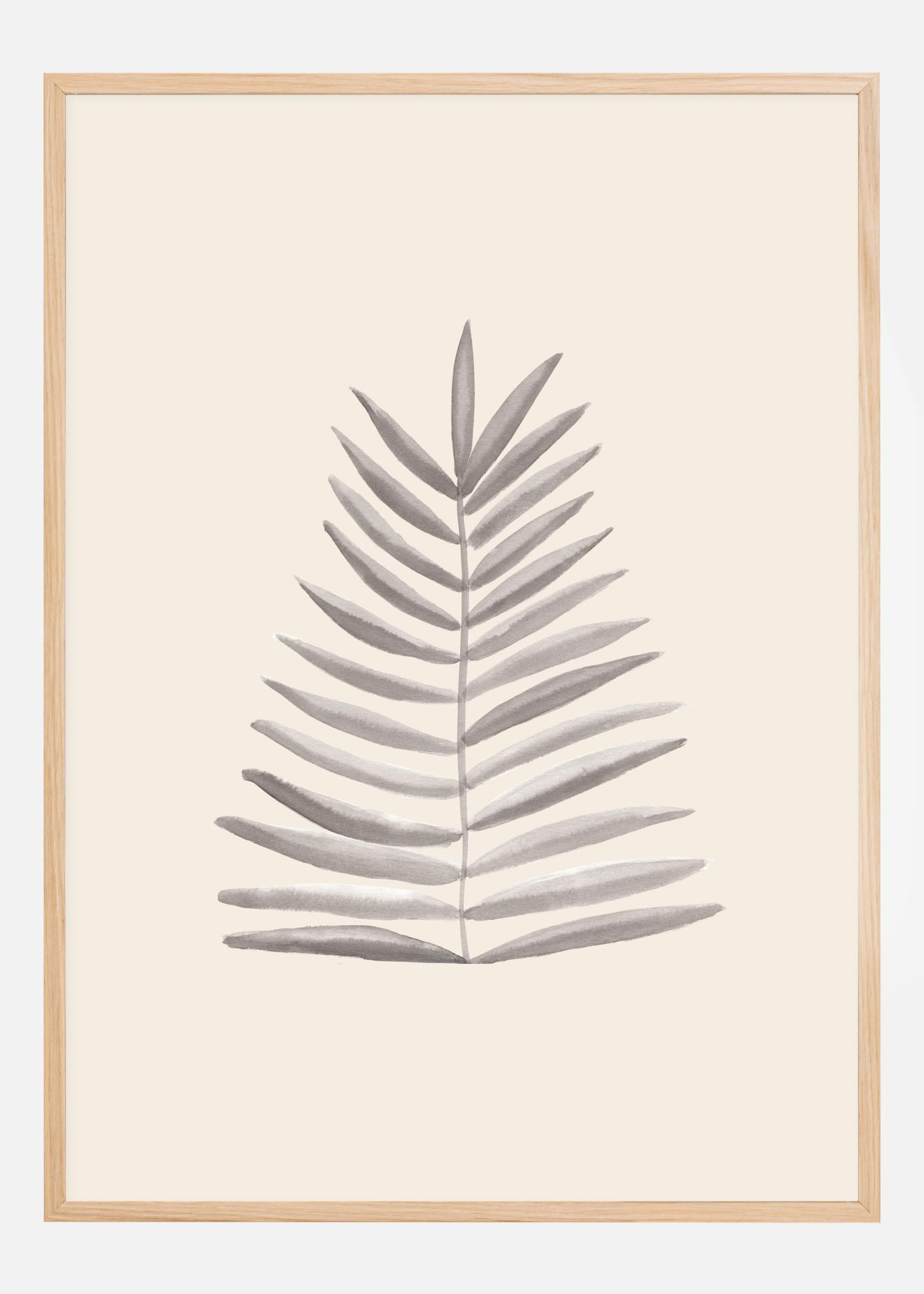 Um póster simples, mas claro, com uma folha de palmeira. Desenhada num fundo branco-creme, a folha fica em pé em seu caule. O fundo branco-creme realça a pequena folha de palmeira marrom. Adicione esse toque de classe numa parede colorida.