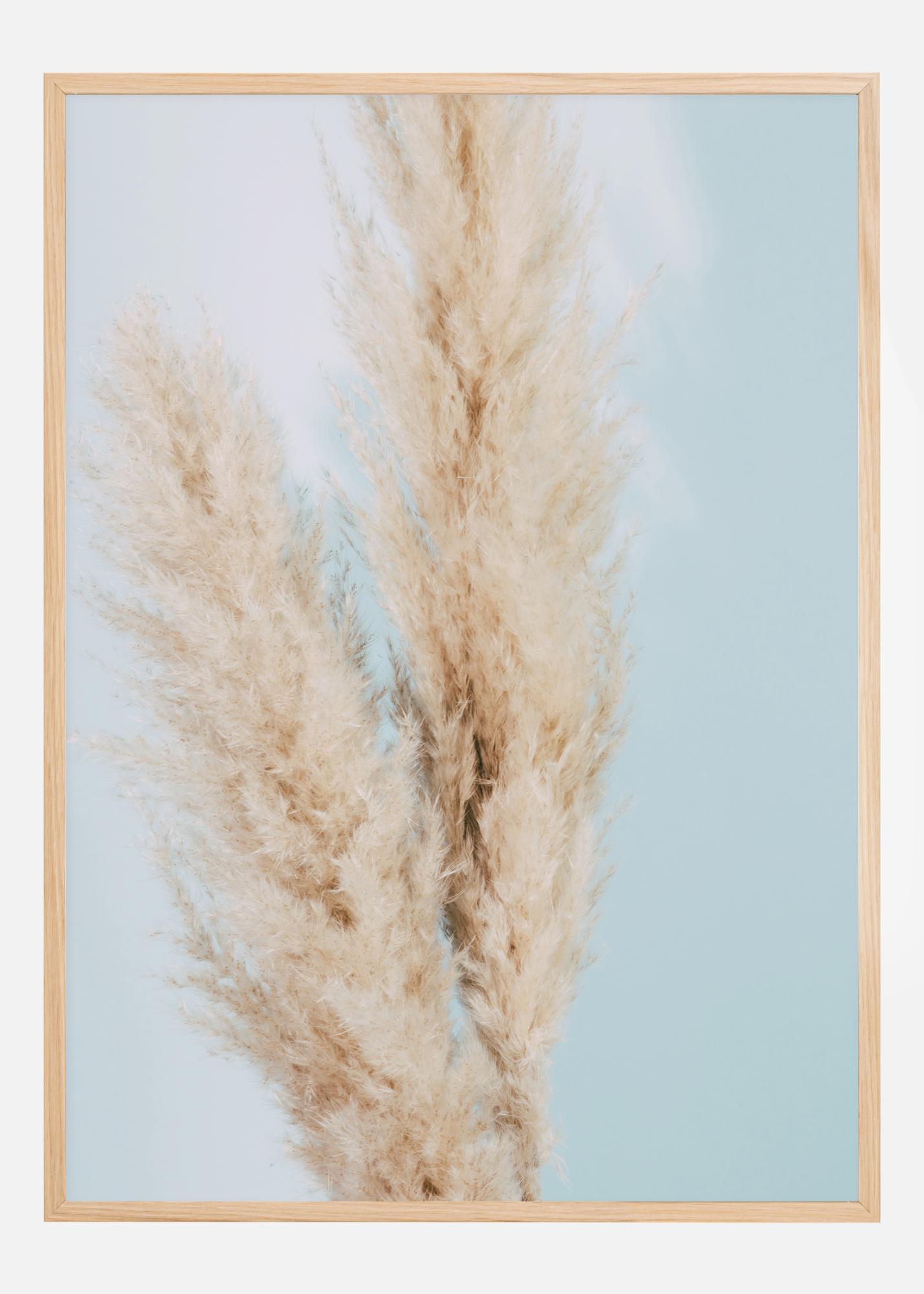 Um póster com uma grama de pampa brilhante sob um céu azul claro. As plumas prateadas proporcionam um contraste audacioso com o céu azul claro. Você quase pode sentir a suavidade das penas quando a imagem está pendurada no seu quarto.