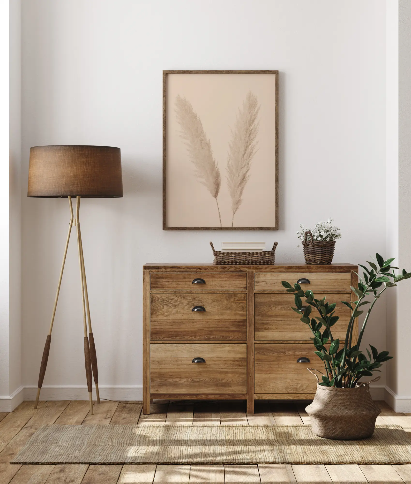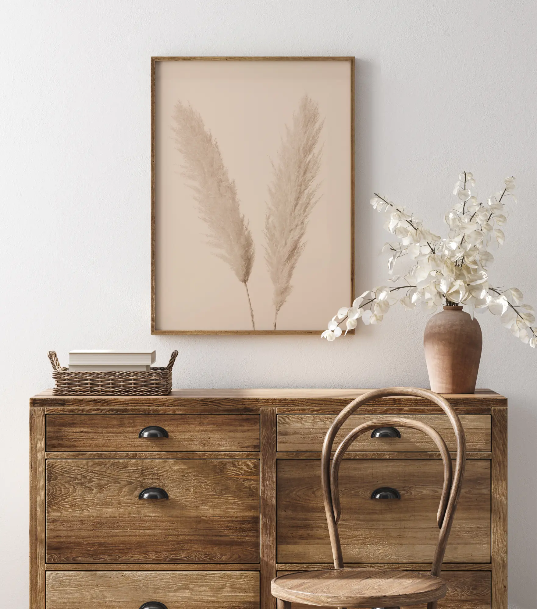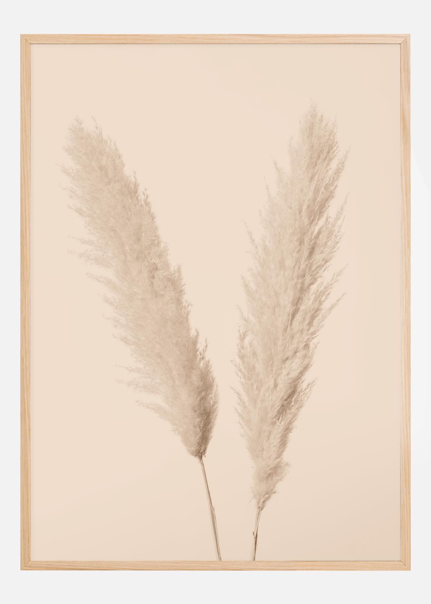 Um close-up com duas cabeças de capim-pampas. As cores pastel suaves e os tons de rosa nesta imagem realmente destacam as hastes adorávels da grama. Você quase pode sentir a tranquilidade vindo em ondas enquanto olha para este póster.