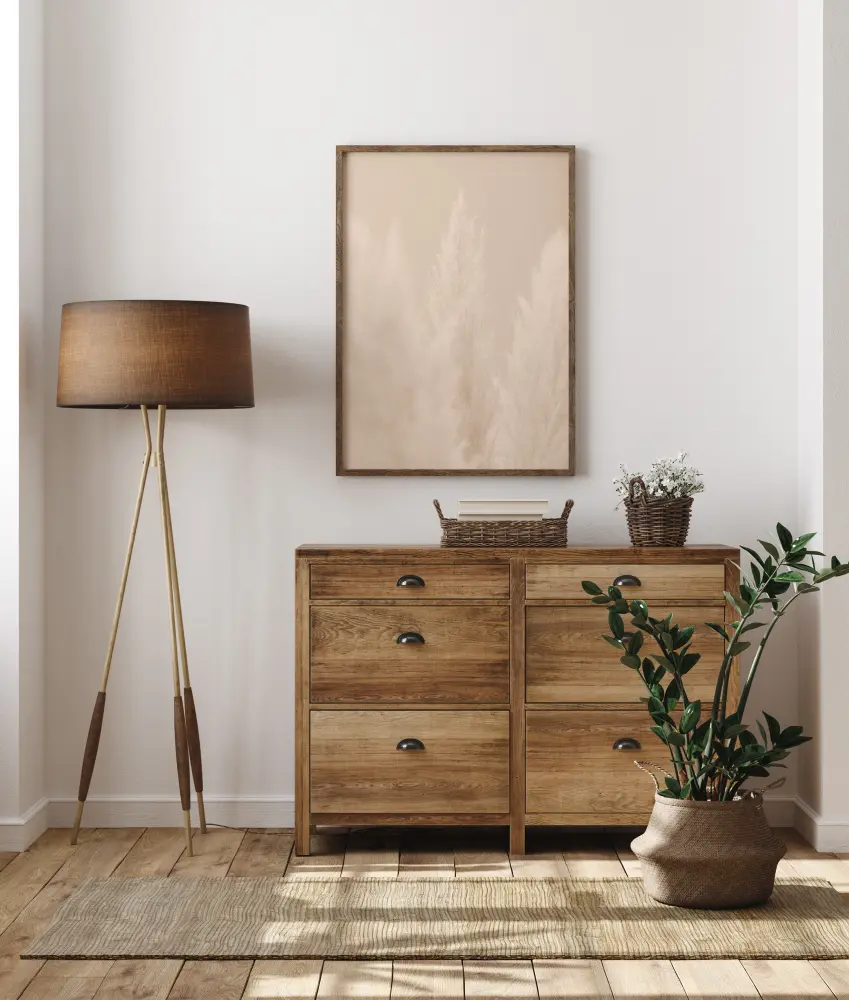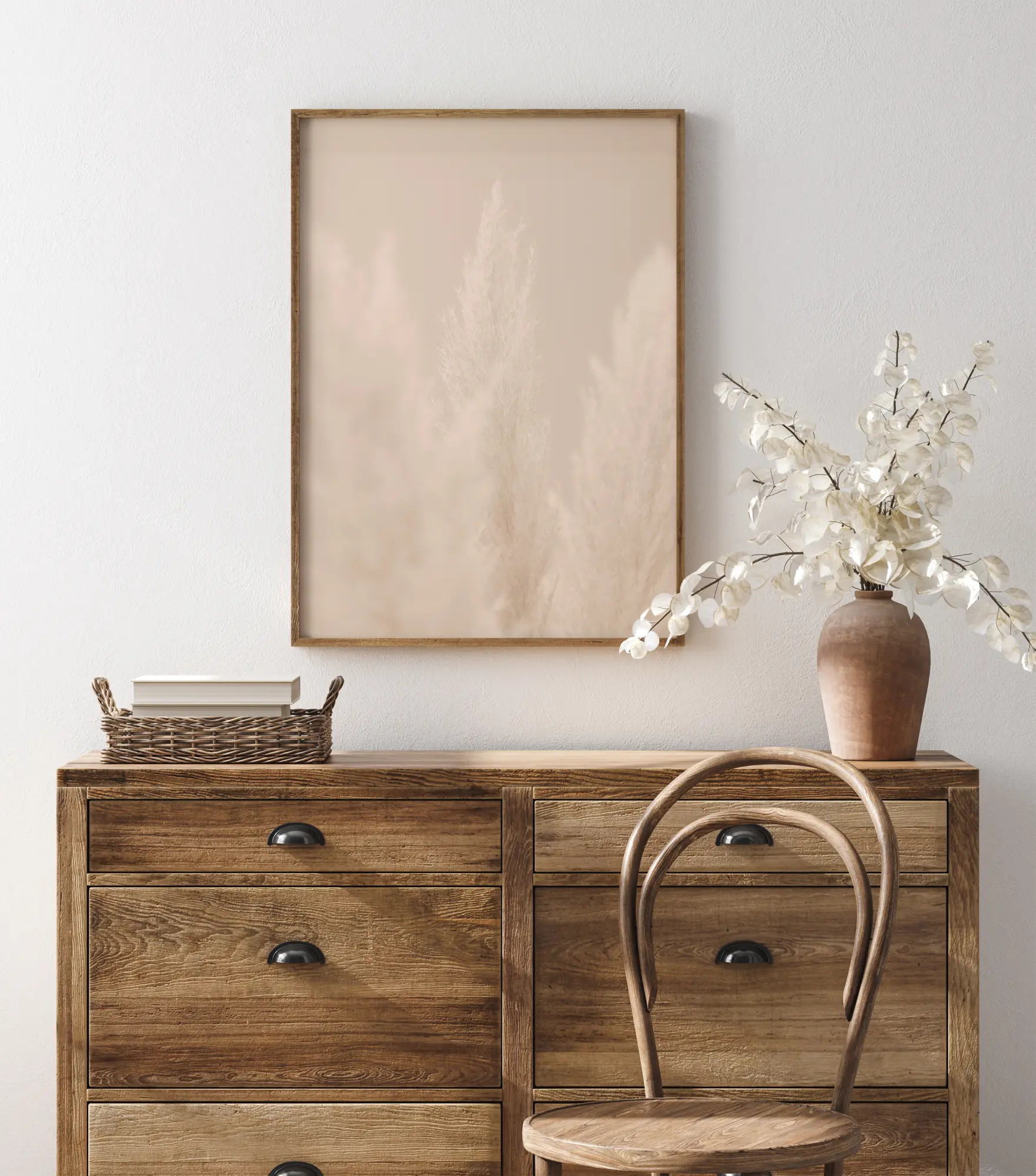 Um póster angelical com close-ups de capim-pampas. Sonhe com a nuvem adorável e semelhante a um molho nesta imagem simples, mas elegante. Combine com outras cores pastel para criar uma sensação verdadeiramente etérea em casa.