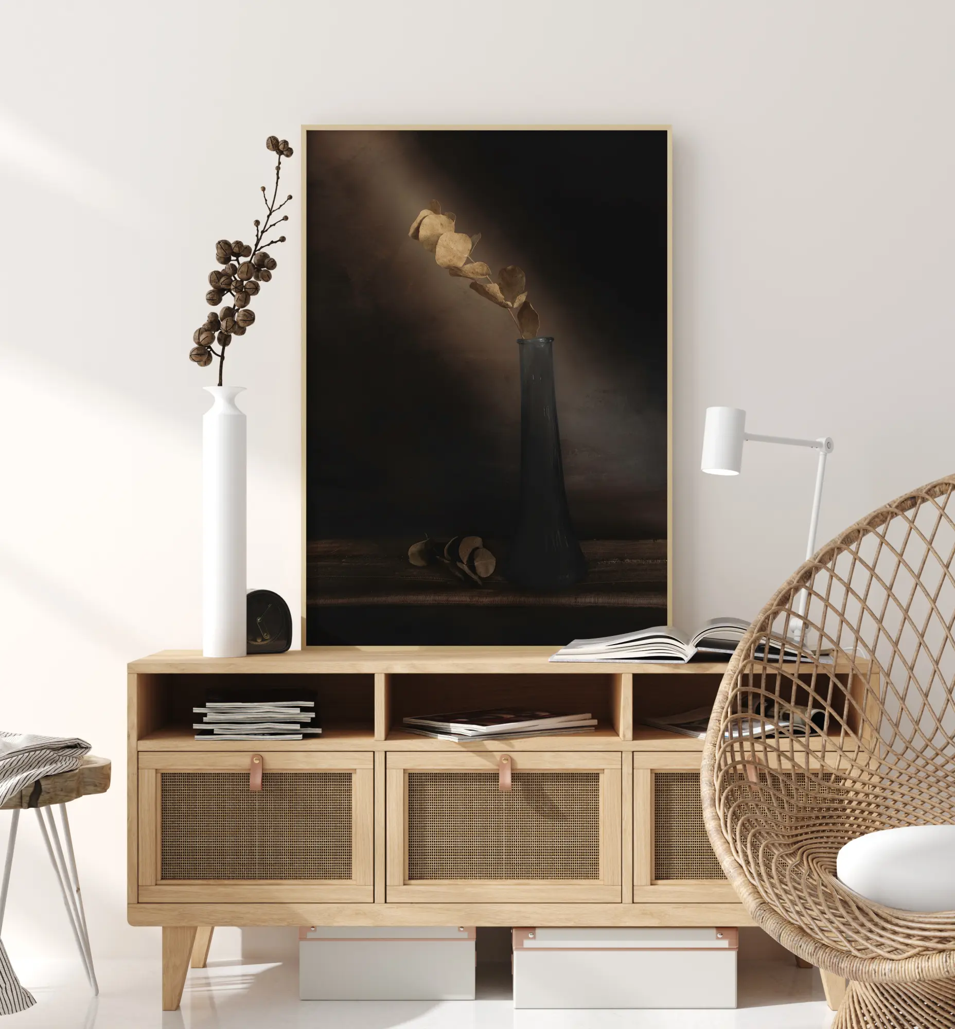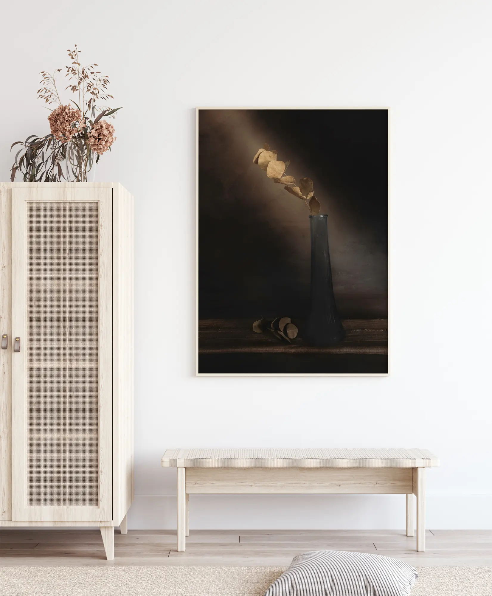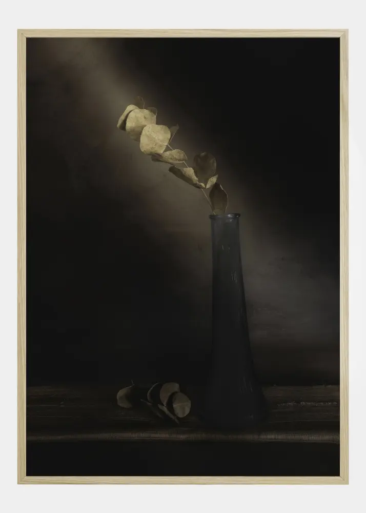Uma impressão simples, mas bonita, de um único caule com folhas secas em um vaso de vidro. Contra um fundo marrom claro, a luz natural brilha diretamente na grama seca. Na parte inferior da imagem, há uma coleção de folhas que caíram do caule. Um póster encantador para pendurar num ambiente tranquilo.