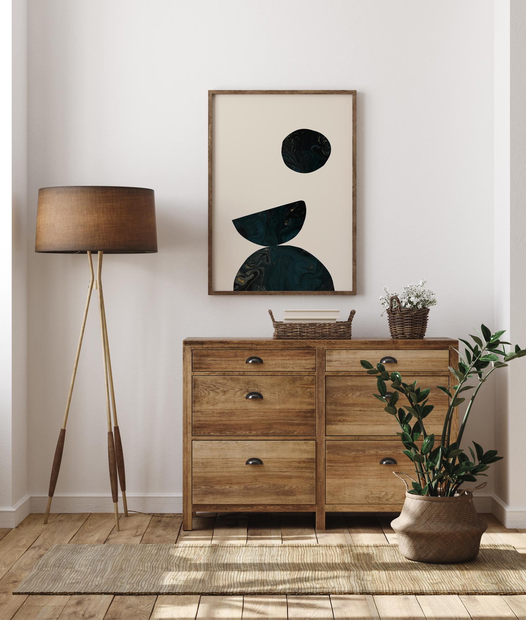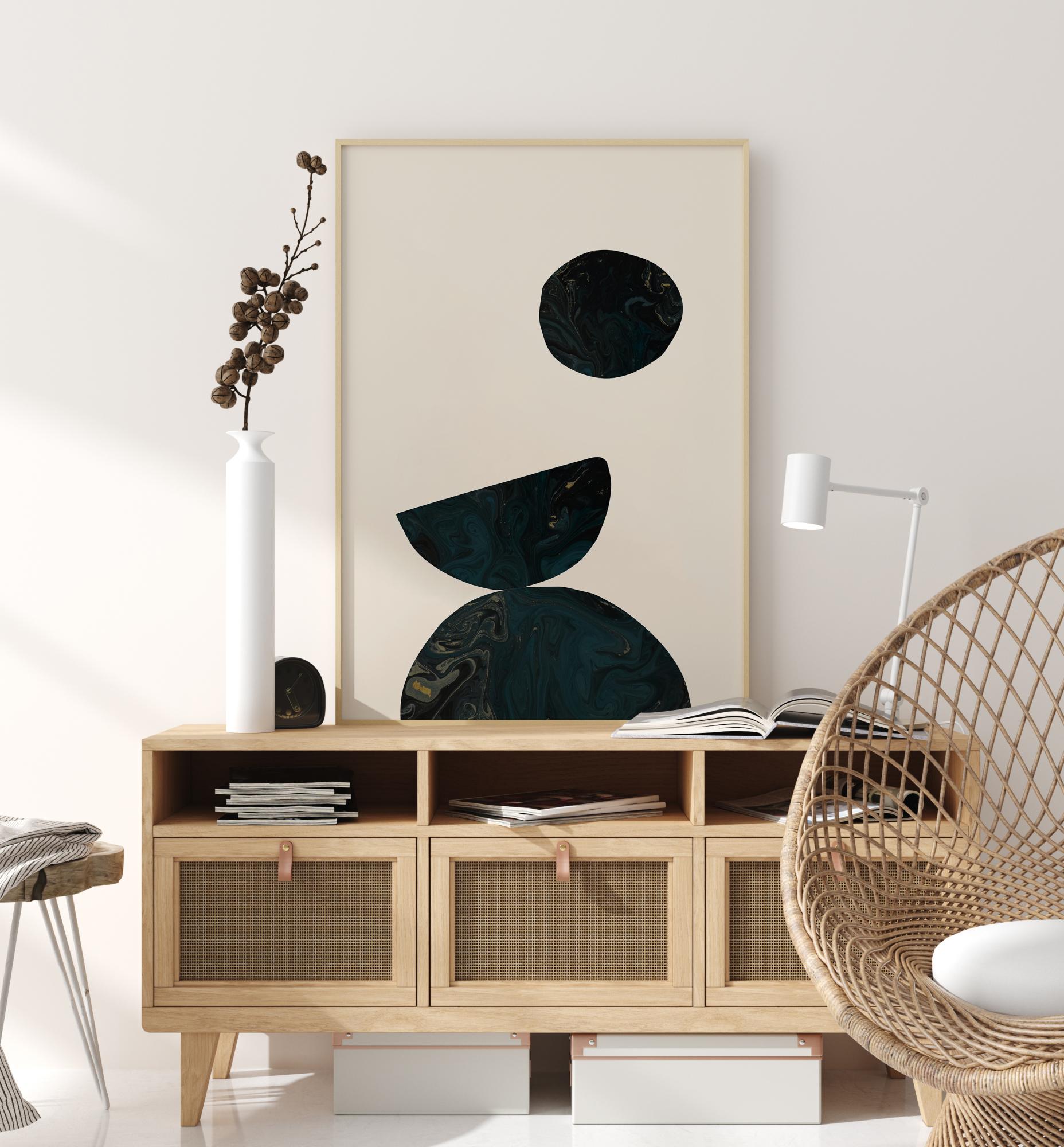 Um póster claro com três formas azul escuro e preto que criam uma imagem impressionante. Um semicírculo é colocado na parte inferior e equilibra outro semicírculo invertido. Acima, flutua um círculo preto. Tudo isso num fundo branco contrastante. Combine as belas espirais marmorizadas com um tom mais claro nas paredes para um drama extra.