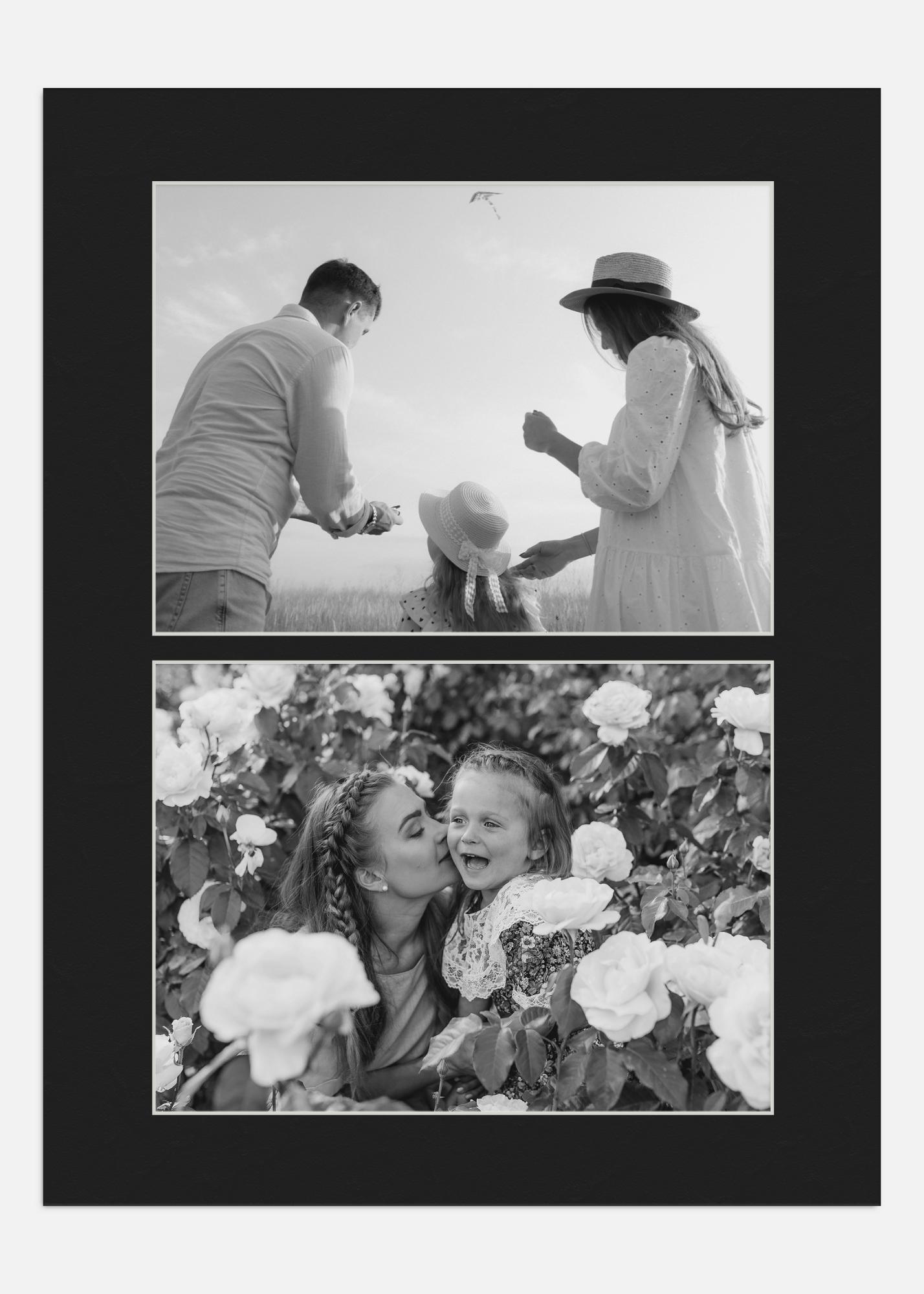 passe-partout de colagem preto sem ácido com bordas brancas cortadas em ângulo de alta qualidade. O passe-partout tem espaço para 2 fotos. Perfeito quando quer fazer sua própria colagem de fotos.