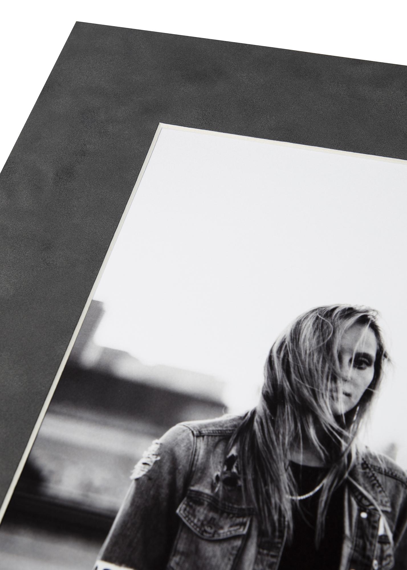 O passe-partout tem uma sensação luxuosa de camurça e é de uma tonalidade preta marcante. Passe-partouts escuros como este são especialmente bons para realçar motivos claros.