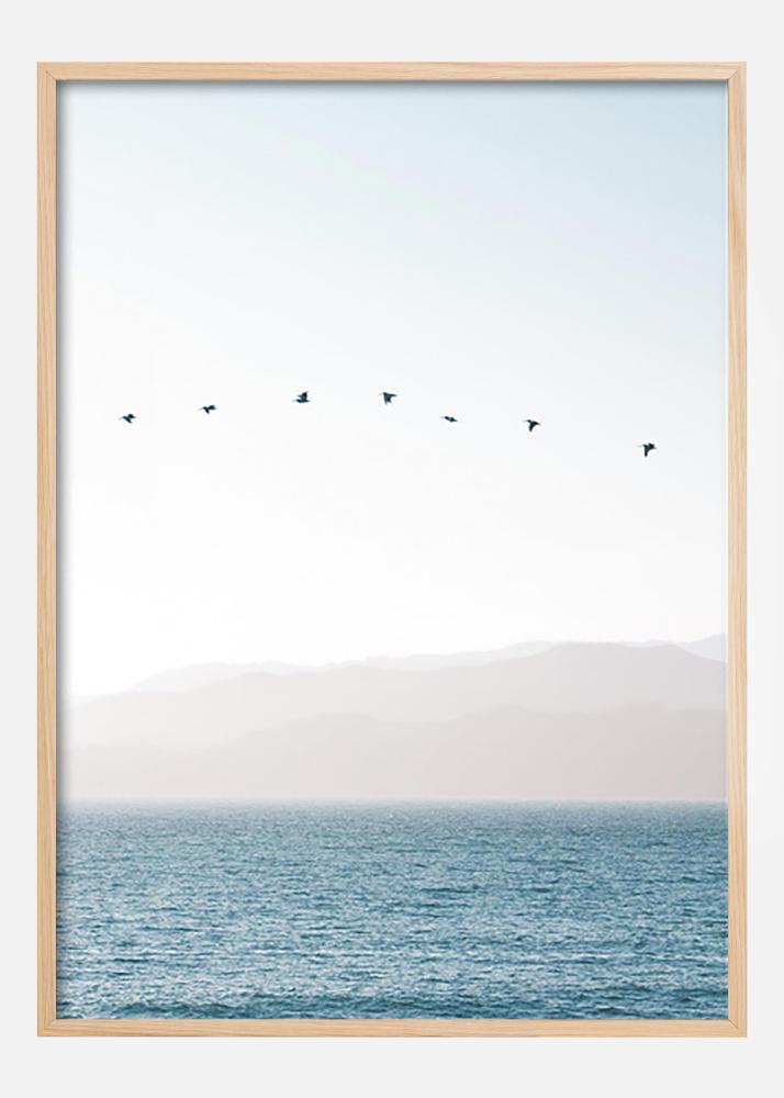 Uma bela fotografia da natureza de pássaros flutuando sobre água azul em frente a montanhas distantes e um céu branco. Um póster tranquilo e harmonioso em tons refrescantes que se adequa tanto à casa de banho quanto ao quarto ou sala de estar.