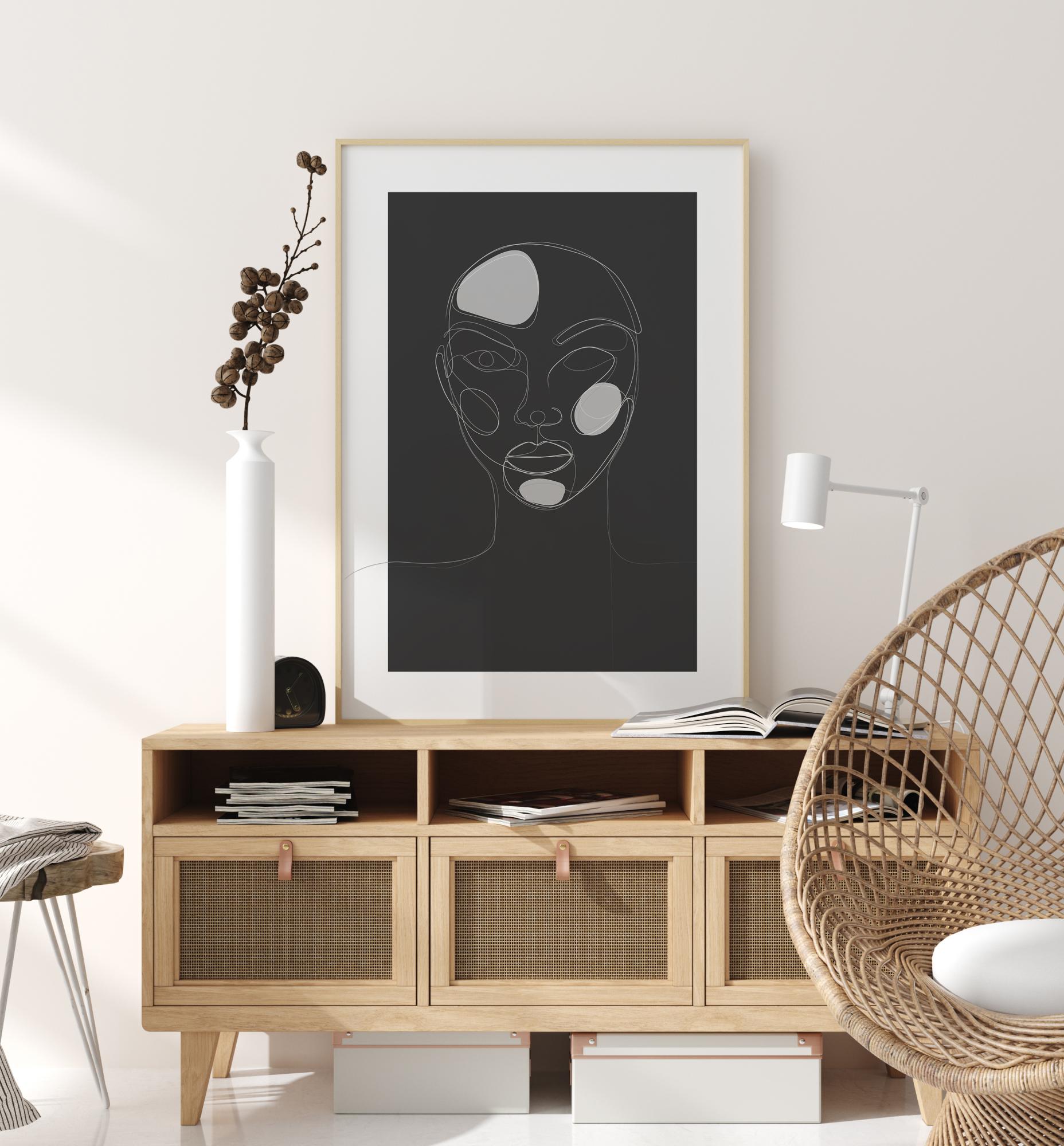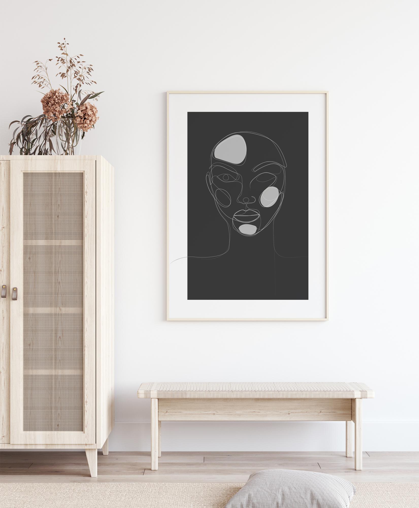 Um póster fantástico da cabeça e ombros de uma mulher desenhados num fundo preto. Três manchas brancas marcam a testa, bochecha e queixo da mulher. A impressão é um simples desenho em linha com todos os traços contornados em branco. Uma impressão poderosa para pendurar em casa.