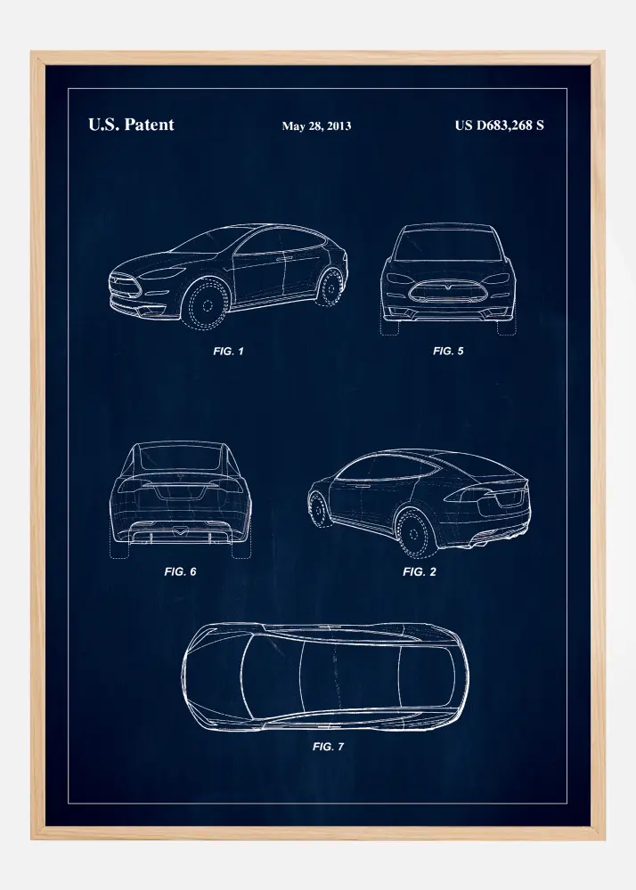 Apresentamos orgulhosamente este pôster de patente, uma representação gráfica do US D683,268 S, concedida em 28 de maio de 2013, que retrata um design de veículo da Tesla tão inovador quanto esteticamente atraente. O pôster é uma adição ideal para qualquer casa de colecionador ou ambiente de trabalho, oferecendo uma visão única do processo de design por trás de uma das formas mais proeminentes na indústria automotiva.