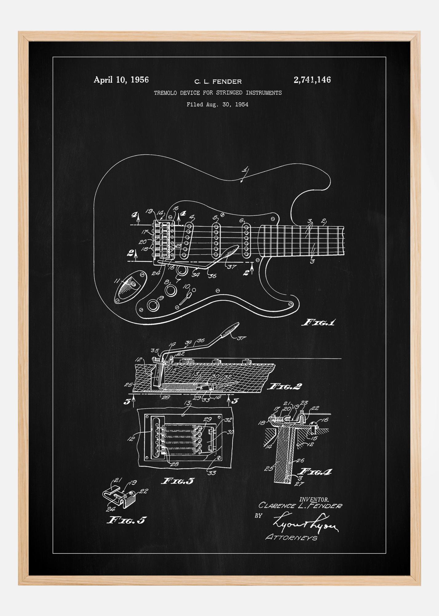Com sua apresentação original em um quadro negro clássico, este desenho de patente destaca o design inovador que mudou a forma como as guitarras eram tocadas. A patente, que foi inicialmente registrada em 30 de agosto de 1954, é ilustrada com precisão e cuidado, criando uma obra de arte que é tanto informativa quanto inspiradora. Um presente ideal para guitarristas, historiadores da música ou aqueles que apreciam o artesanato clássico, este pôster certamente será uma parte valorizada de qualquer coleção.