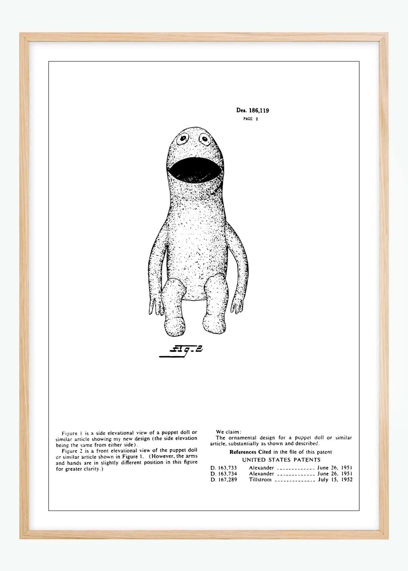 Este cartaz de patente mostra um brinquedo de Kermit. Com o número de patente Des. 186,119, esta ilustração é uma documentação oficial de uma boneca com uma estética charmosa e incomum. A figura no desenho oferece uma visão frontal completa, destacando os detalhes e a forma da boneca, e transmite uma sensação de caráter e personalidade que pode ser apreciada por crianças e adultos.