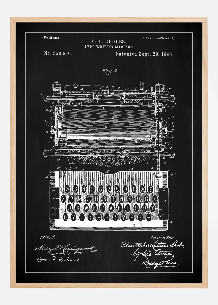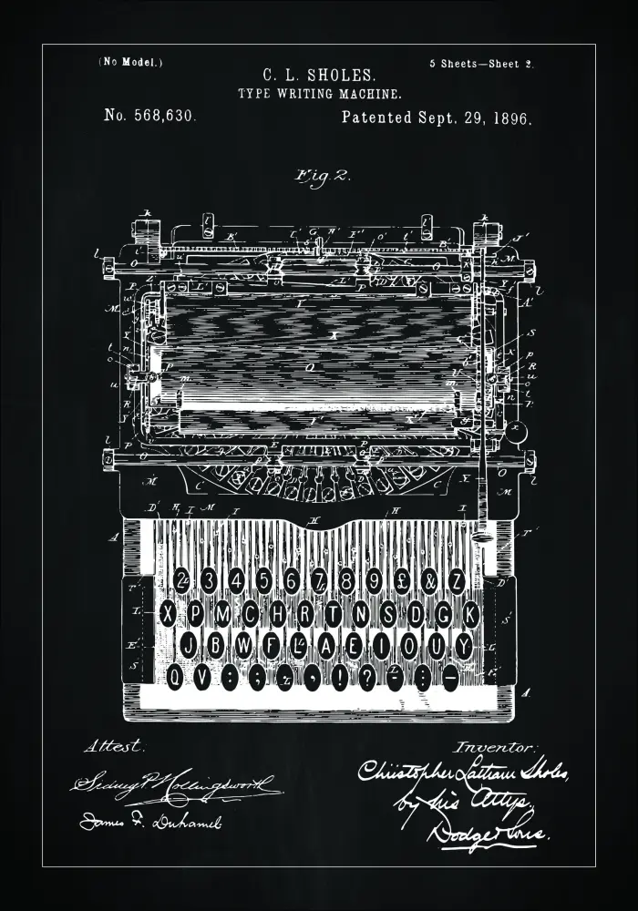 Este icônico pôster de patente ilustra a histórica patente No. 568.630, concedida em 29 de setembro de 1896 a C. L. Sholes para uma máquina de escrever. A ilustração majestosa mostra a complexidade mecânica de uma máquina de escrever antiga, completa com o arranjo das teclas e os mecanismos internos. Detalhes como o complicado mecanismo de tipos e o belamente disposto teclado destacam-se contra o fundo preto profundo e conferem uma sensação de elegância vintage.