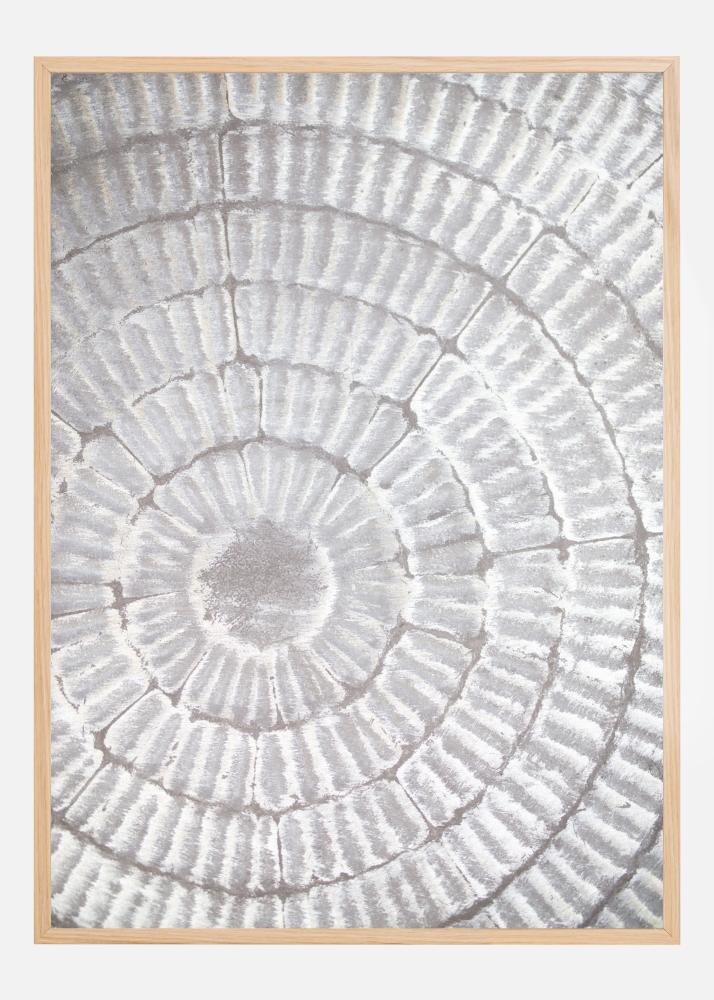 Um póster de vidro com uma placa de padrão cinzento. Os anéis circulares bege e brancos criam uma aparência listrada na placa, formando um círculo perfeito no centro. Com as suas cores suaves e calmantes, esta bela imagem cria um mistério tranquilo. Perfeito para pendurar numa parede colorida.