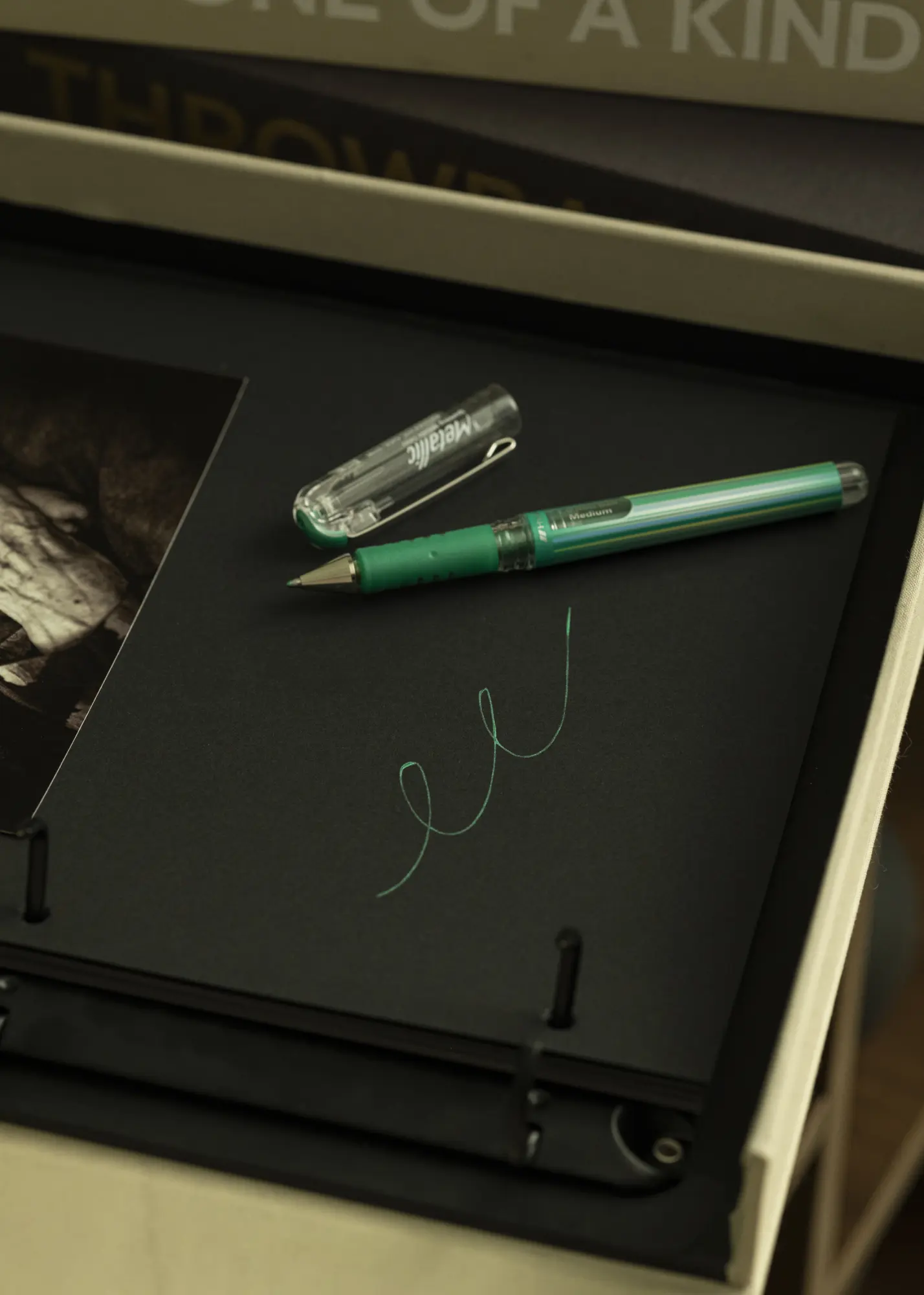 Iniciar o seletor de molduras »Caneta da Pentel com uma cor verde metálica impressionante. A caneta tem uma largura de ponta de 1 mm.