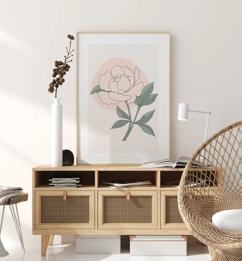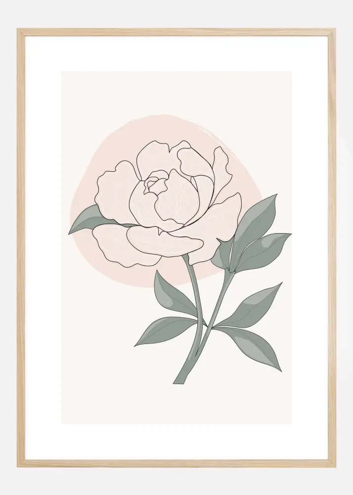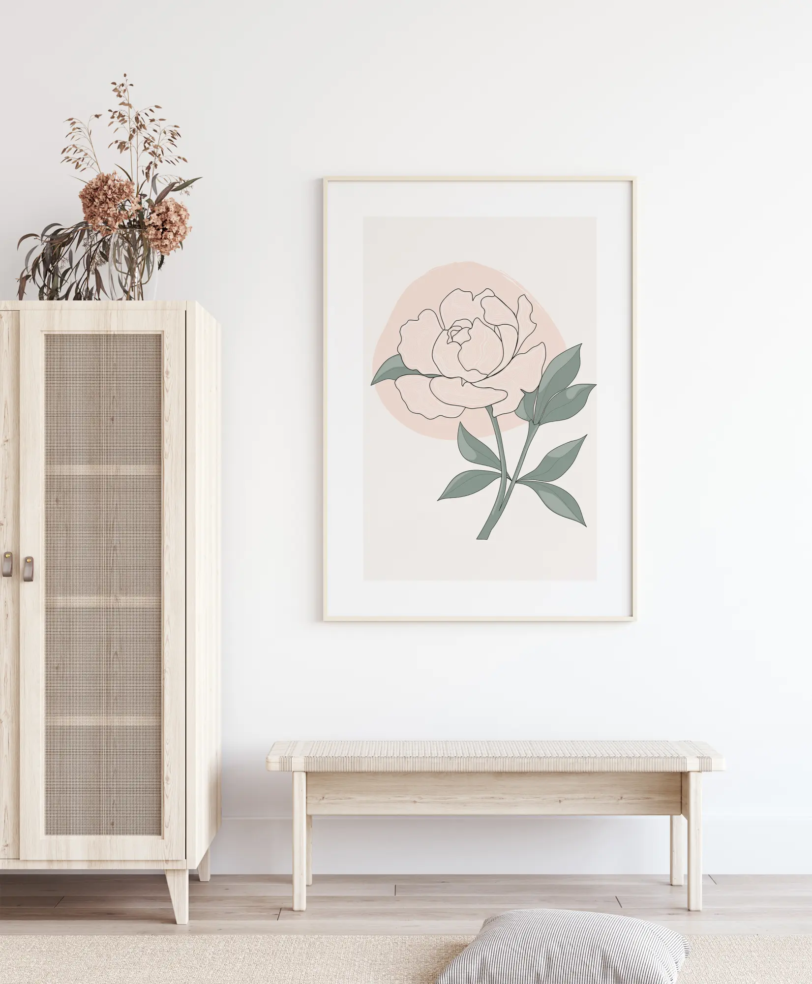Um póster artístico com um caule de peônia e uma flor rosa. Num fundo bege, a flor rosa é colocada em uma figura cor de pêssego, enquanto as folhas são esboçadas em preto. Traga a delicadeza desta flor para a sua casa.