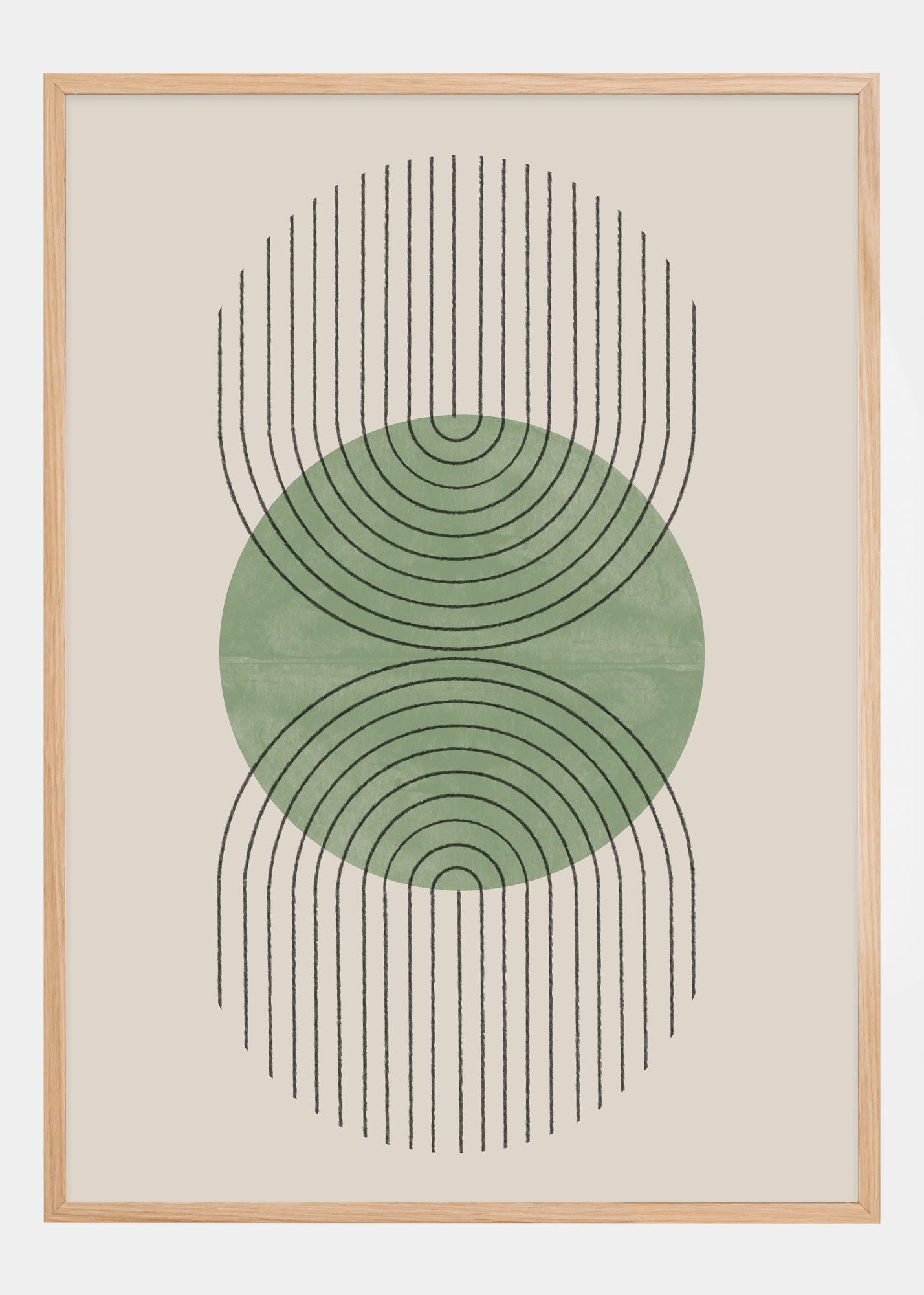 Este cartaz é uma obra de arte minimalista que destaca uma forma circular verde saturada cercada por uma série de linhas pretas, criando uma sensação de espaço e profundidade. A tonalidade verde do círculo varia em intensidade, criando um efeito visual de dimensão e textura. As linhas, que se estendem para fora da borda do círculo, criam um efeito quase hipnótico e representam uma harmonia geométrica.