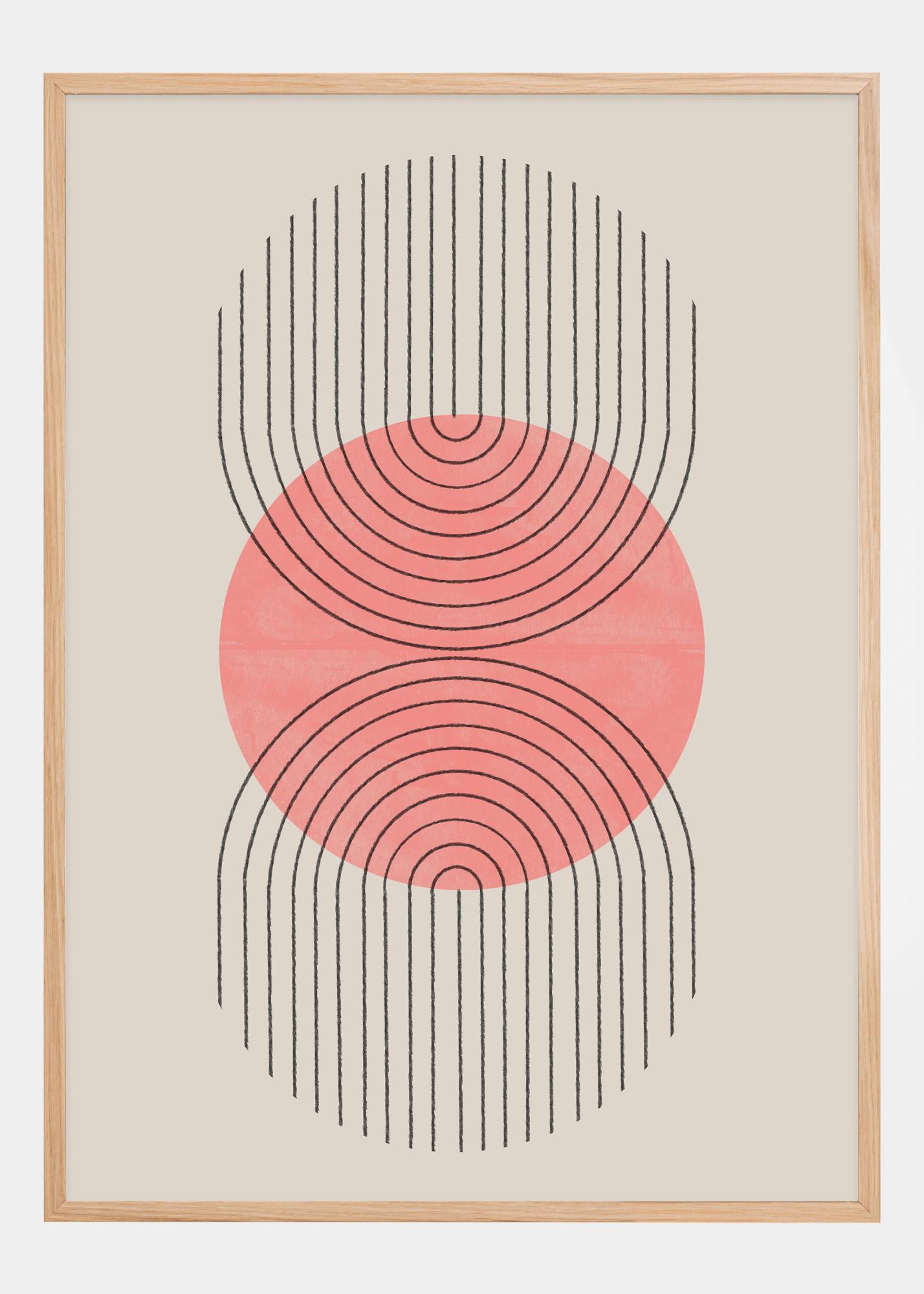 Este pôster contemporâneo combina a simplicidade da forma geométrica com um tom suave e atraente de pêssego. Um círculo central com anéis concêntricos, que lembra uma superfície de água tranquila, é cercado por um campo de linhas verticais pretas que parecem pulsar para fora. Este contraste entre a forma redonda e as linhas retas cria uma dinâmica interessante e uma sensação de movimento na obra de arte.