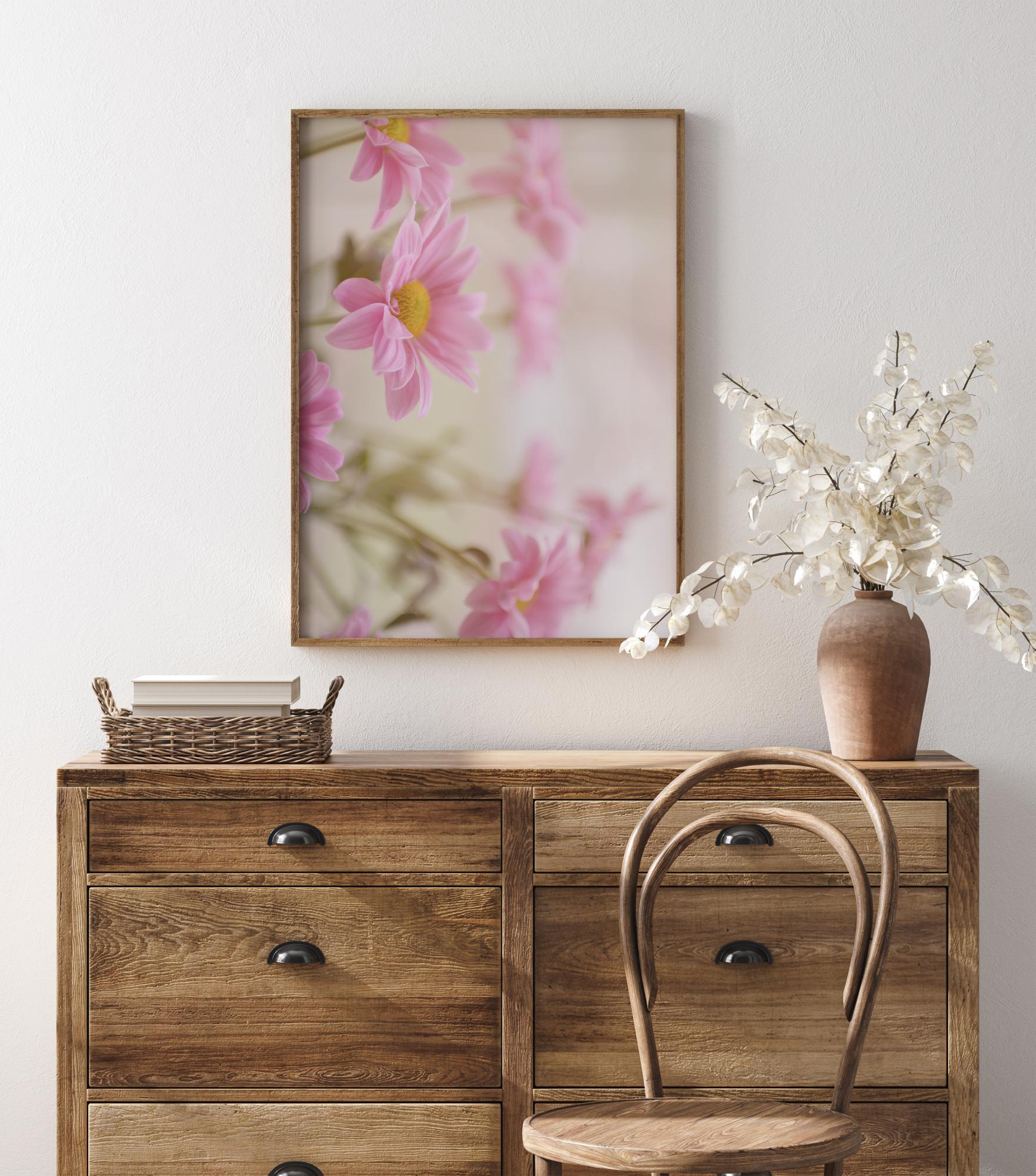 Um póster em close-up com belas margaridas rosa. Num fundo bege, a beleza das flores cria uma atmosfera alegre e tranquila. Com um estame amarelo claro, esta é a impressão perfeita para criar uma sensação de paz e amor.