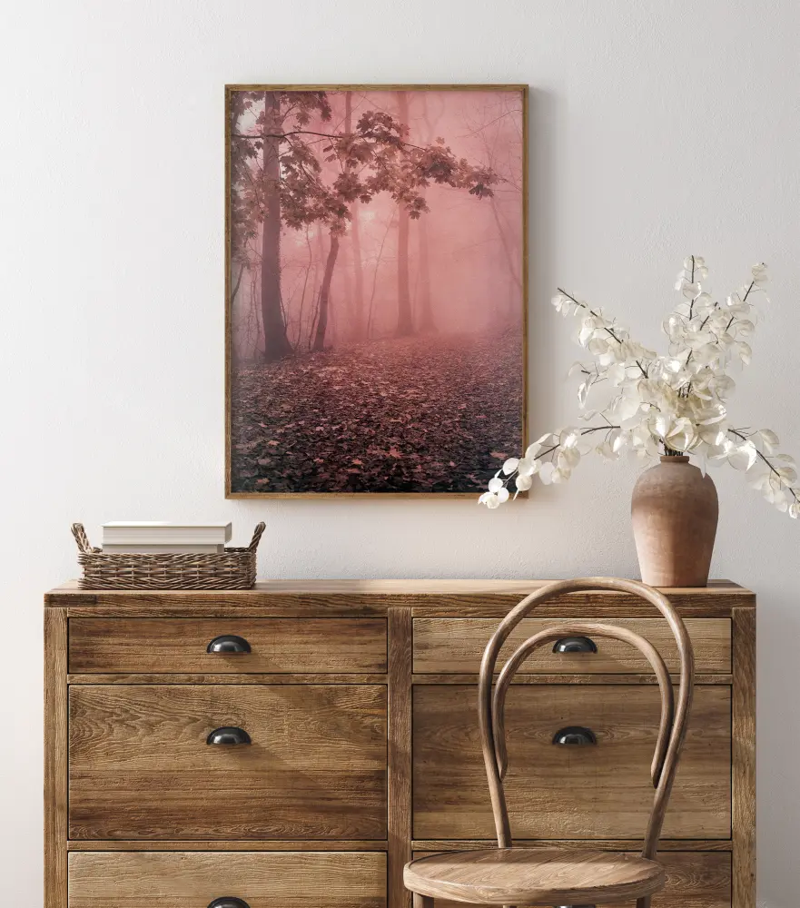 Uma impressão fantástica e calmante de uma floresta rosa no outono. Com as folhas de outono no chão, a bela névoa cria uma atmosfera misteriosa, mas ainda assim pacífica na floresta. Um póster adorável que aquece o seu quarto frio durante as noites de inverno.