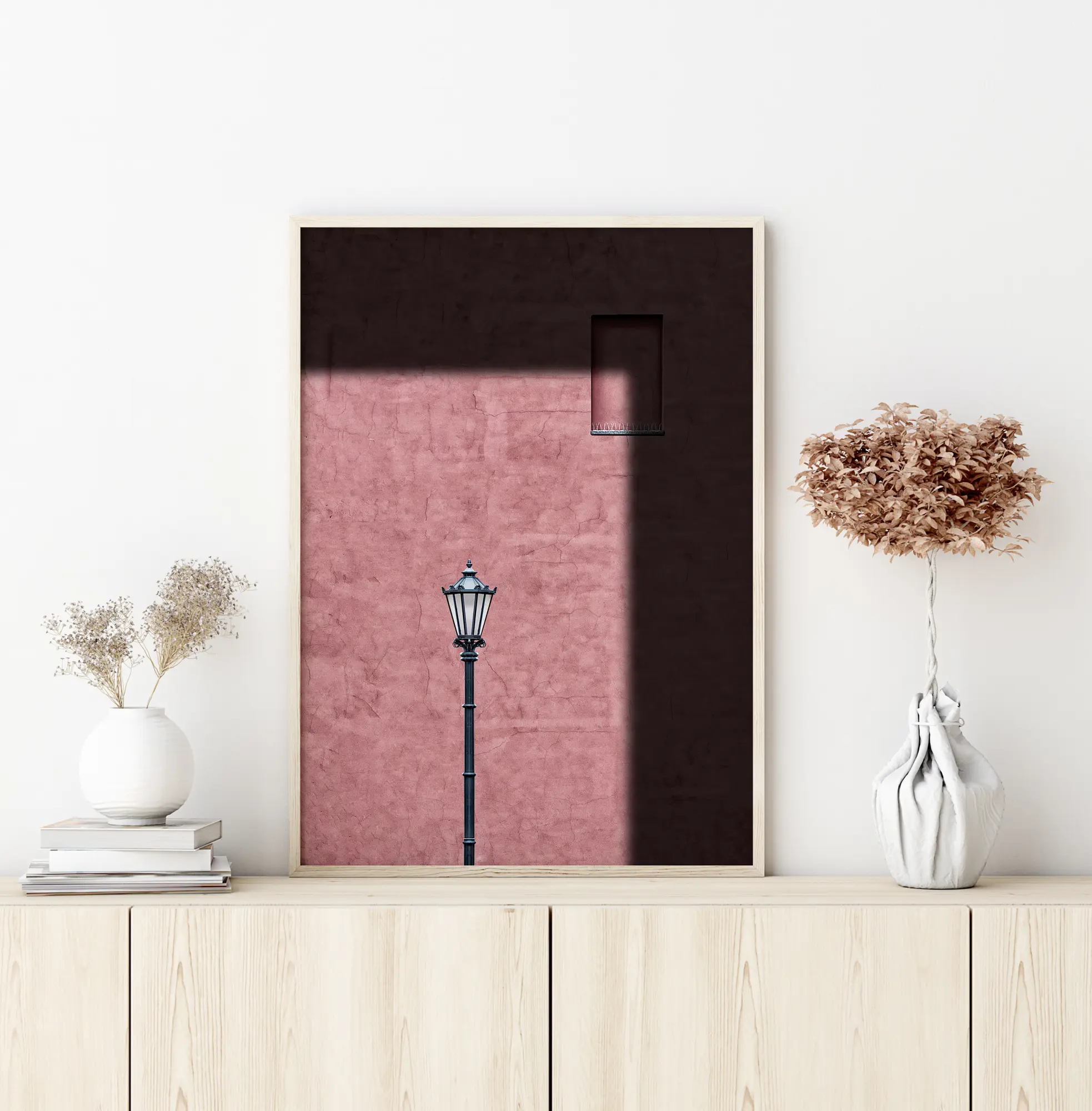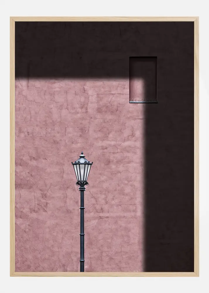 Uma impressão colorida de uma fachada rosa com uma lâmpada externa colocada no meio. A luz solar natural ilumina a parede e deixa a parte superior do póster no escuro. Uma pequena janela de alvenaria pode ser vista no canto superior direito. Traga um pouco de luz para sua casa com este póster rosa suave.