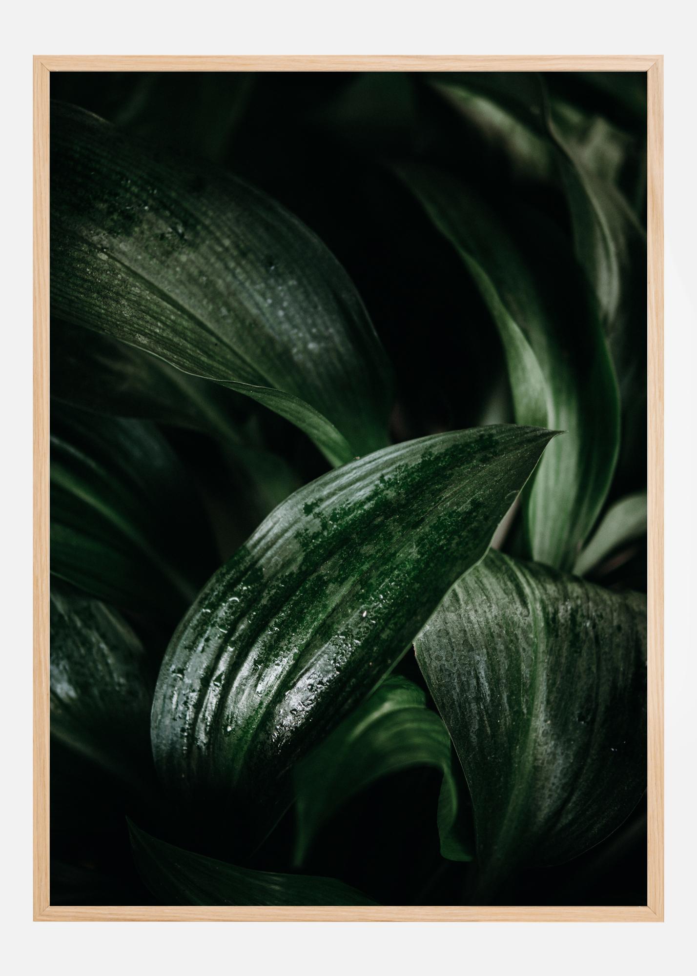 Um close-up de folhas molhadas que cobrem a superfície da imagem. As gotas de água nas folhas criam uma atmosfera brilhante. O fundo escuro e desfocado retrata outras folhas lutando para serem vistas. Essa beleza perfeita é ideal para a sua casa.