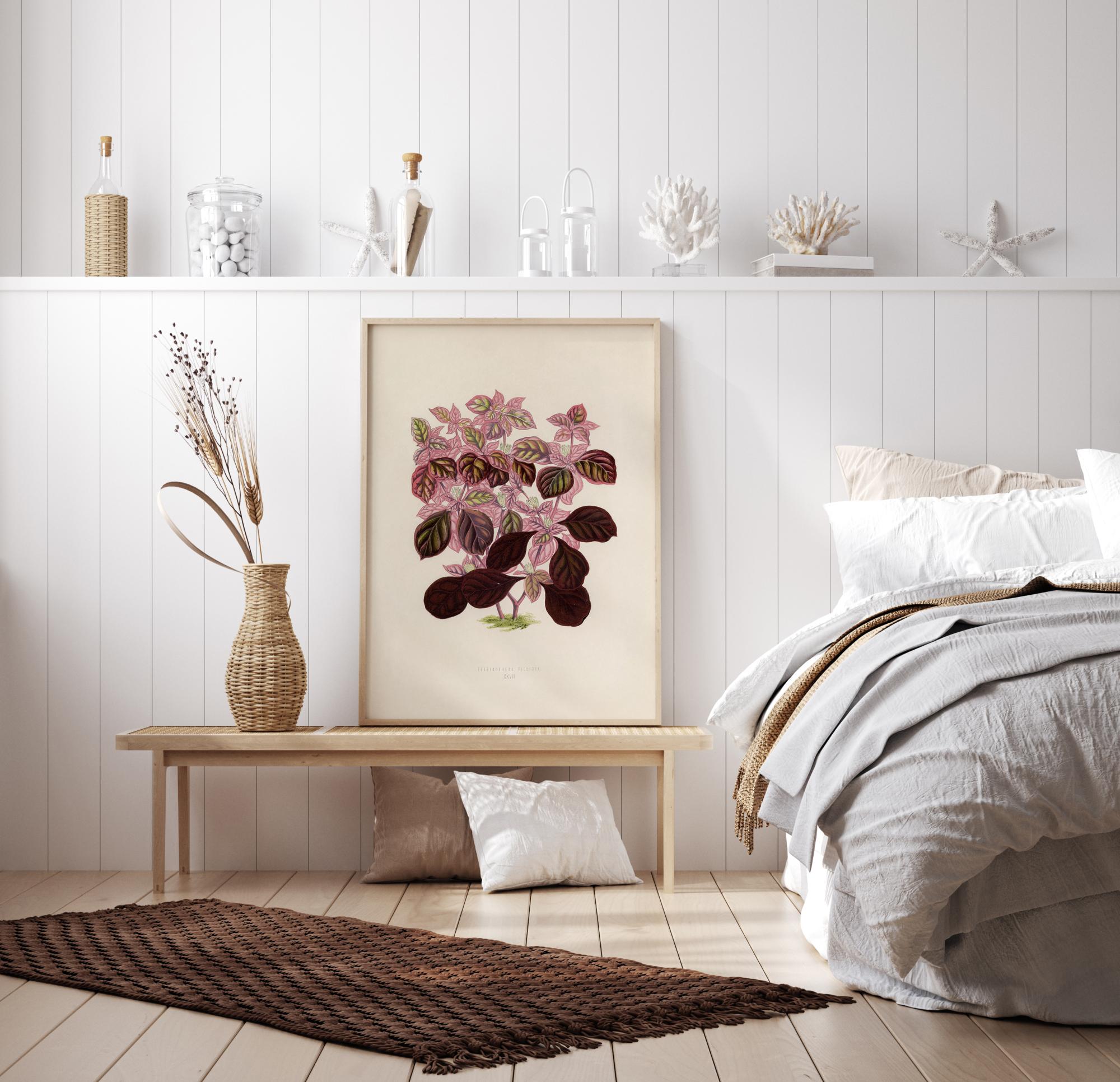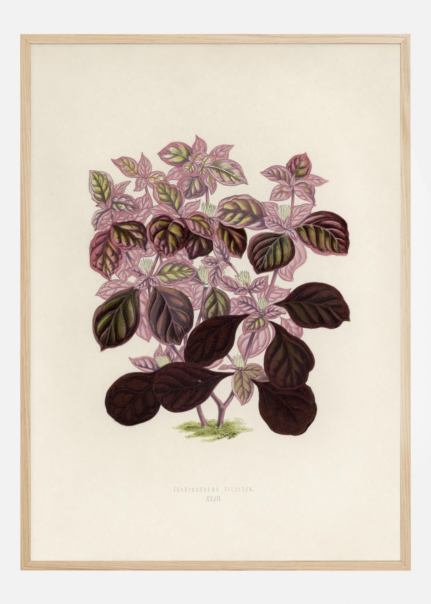 Uma bela impressão manual de duas Plectranthus scutellarioides rosa. O fundo bege suave realça as belas tonalidades de rosa e verde. Descendo em direção ao caule da planta, a cor vinho cria uma sensação calorosa no póster. Pendure esta impressão em sua coleção de arte em casa.