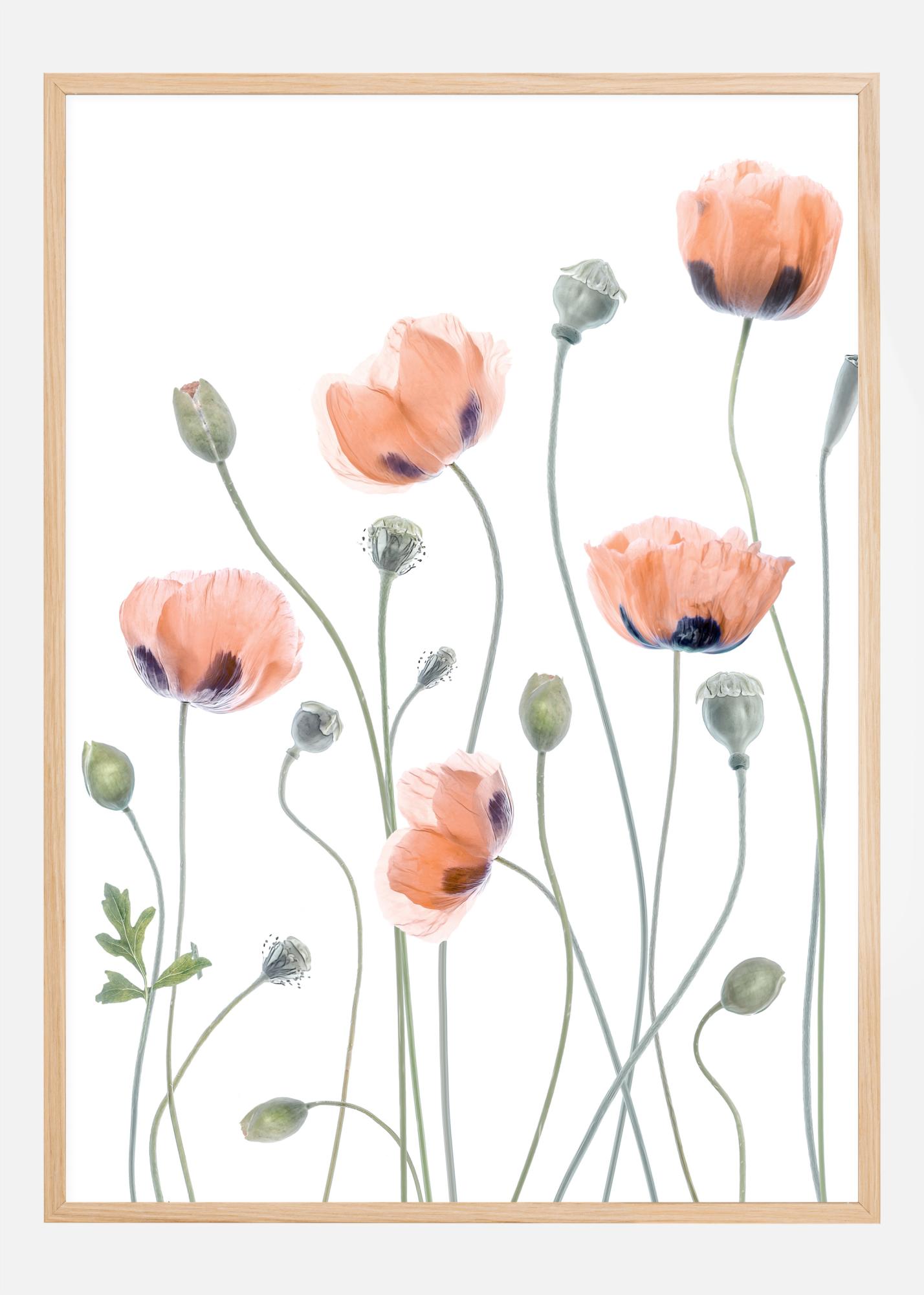 Uma encantadora impressão de papoula entrelaçada com grama seca. Num fundo branco, as flores de papoula cor de pêssego se misturam perfeitamente com a grama verde clara. Cada papoula tem uma altura diferente. Um póster bonito e calmante para pendurar em uma cozinha rural.