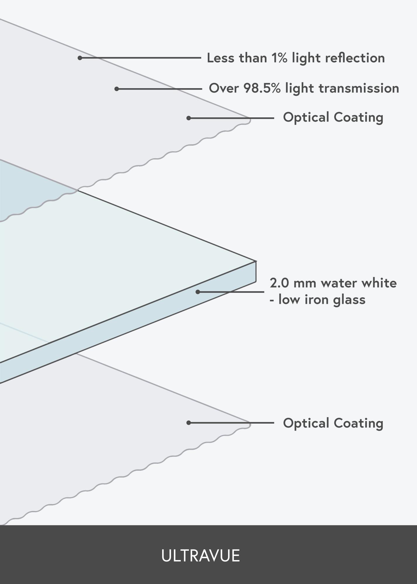 Avoid disturbing reflections and glare with a genuine anti-reflective glass from Tru Vue. With a reflectance of only 1%, the glass becomes almost invisible and provides your images with natural colors and a genuine shine. As a bonus, the glass also provides UV protection and removes 92% of harmful UV rays, ensuring that your images last a long time. UltraVue is also scratch-resistant.