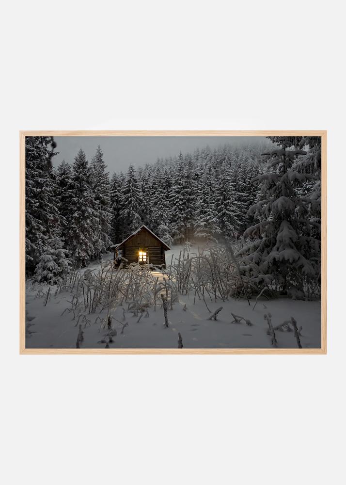 Póster com uma pequena e adorável cabana de madeira num cenário de inverno, nas profundezas de uma floresta de pinheiros. A luz da janela que ilumina a noite de inverno gelada dá profundidade à fotografia e torna a imagem interessante. A imagem encaixa-se em todos os estilos de decoração e ambientes. Fica tão bonita numa moldura de metal preta mais fina quanto numa versão mais robusta de madeira, ou porque não realçar a luz da imagem numa moldura clássica dourada.