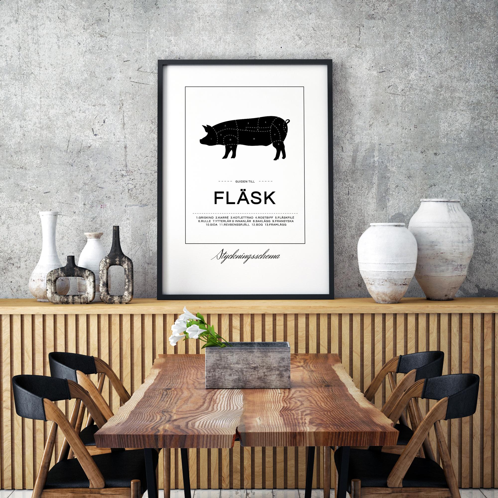 Não são apenas os açougueiros que têm permissão para colocar um belo esquema de corte na parede. Aqui temos um póster preto e branco com uma impressão de um porco com marcações que mostram onde encontrar várias delícias de carne de porco. Abaixo do porco, está escrito "Guia de Porco" junto com uma lista organizada das partes do porco. Os trechos de texto são separados por duas linhas tracejadas e o motivo é enquadrado por um quadrado simples. Abaixo do quadrado, está escrito "Esquema de Corte" com um tipo de letra decorativa.