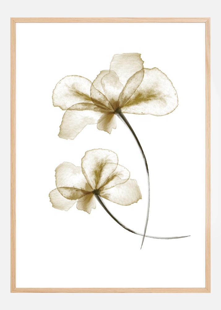 Um póster simples mas elegante com duas flores brancas num fundo branco. Na parte inferior da impressão, as flores se sobrepõem lindamente, dando ao impressão um toque delicado. A transparência dos tons suaves de marrom e bege ficaria perfeita numa parede creme.